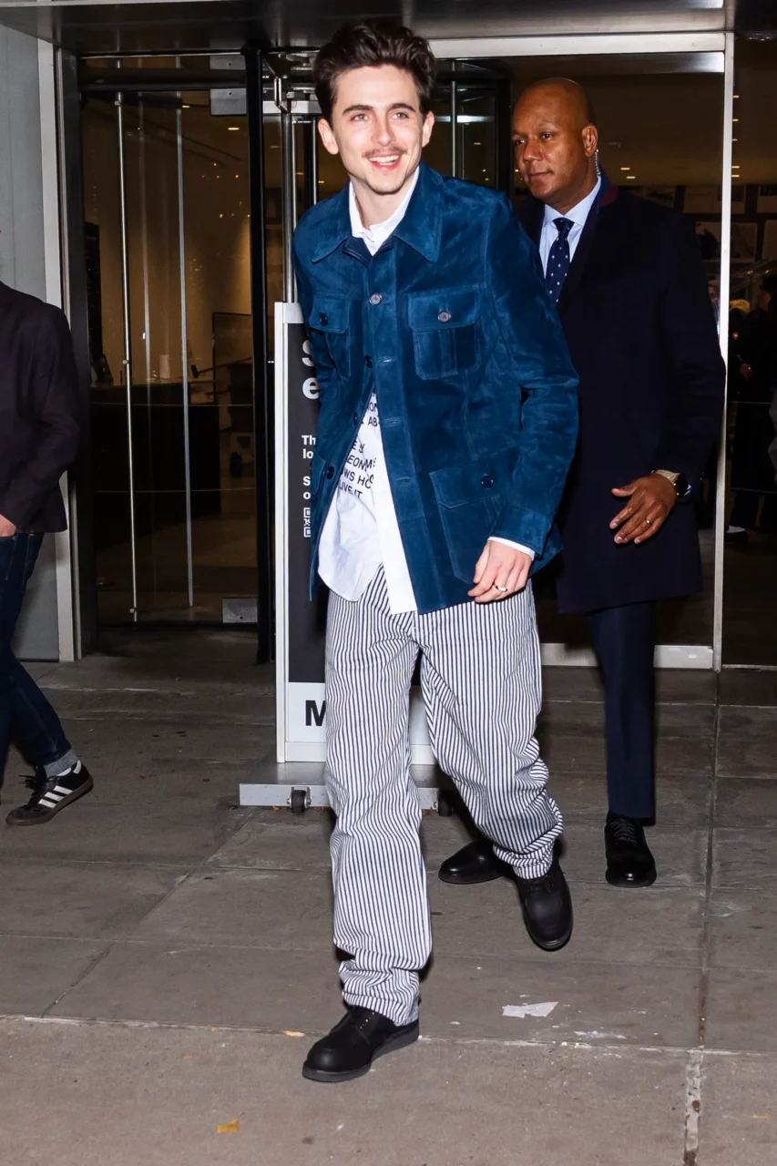 這位演員在現代藝術博物館被拍到,他身穿Chemena Kamali 設計的定制絨面革外套(與Bob Dylan 曾經穿過的藍色軍裝外套看來沒有什麼不同),搭配Hickory Stripe (山核桃條紋)條紋 Bape 褲子,一雙 Red Wing 靴子和一枚幾何形狀的 Cartier 戒指。他的上唇上仍然留著一縷狡猾的小鬍鬚,在他最新的角色以及Chemena Kamali 更廣闊的宇宙中,這與其說是男性的象徵,不如說是波希米亞式的成熟的象徵。
