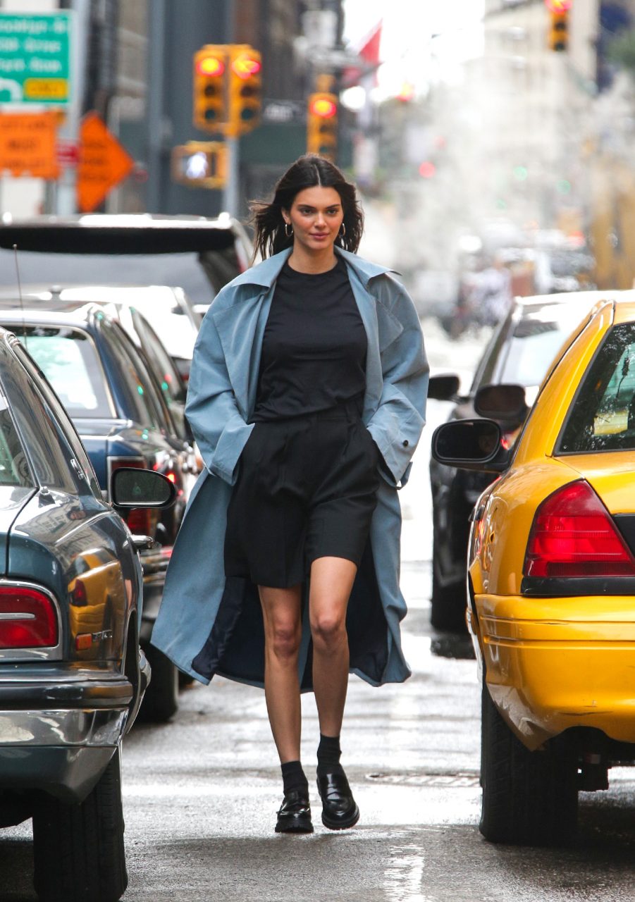 Kendall Jenner的風衣造型展現簡約大氣的審美,隨意又不普通,把藍色風衣穿成自己的經典,內襯黑色短袖和短褲,呈現極簡高級感穿搭。