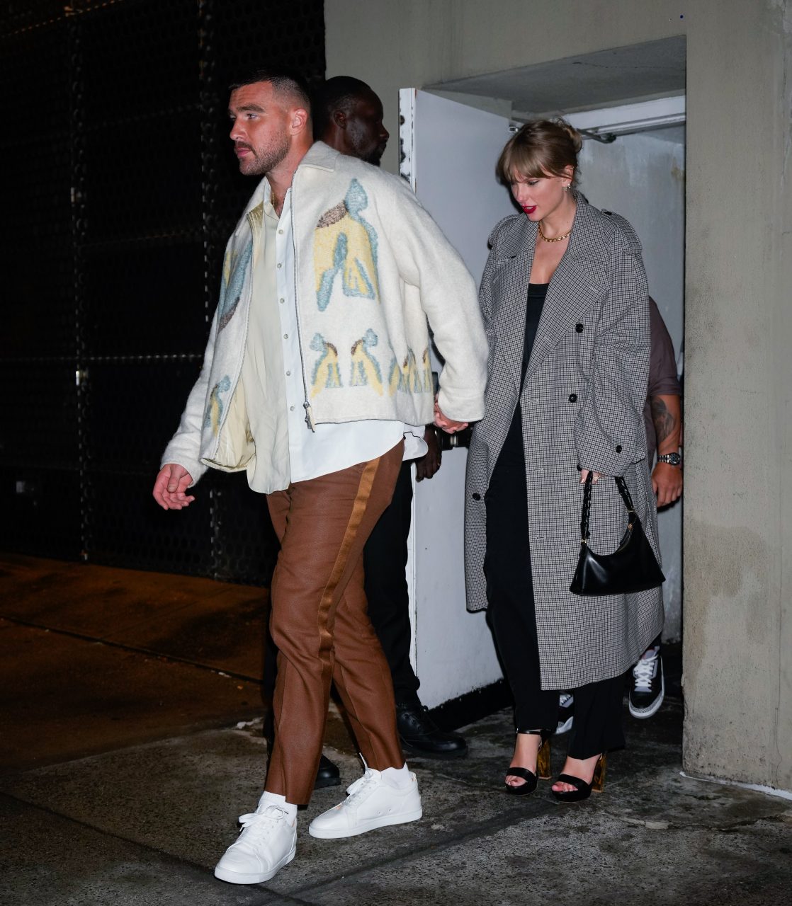 NEW YORK, NEW YORK - OCTOBER 15: Travis Kelce and Taylor Swift depart the SNL Afterparty on October 15, 2023 in New York City. (Photo by Gotham/GC Images)