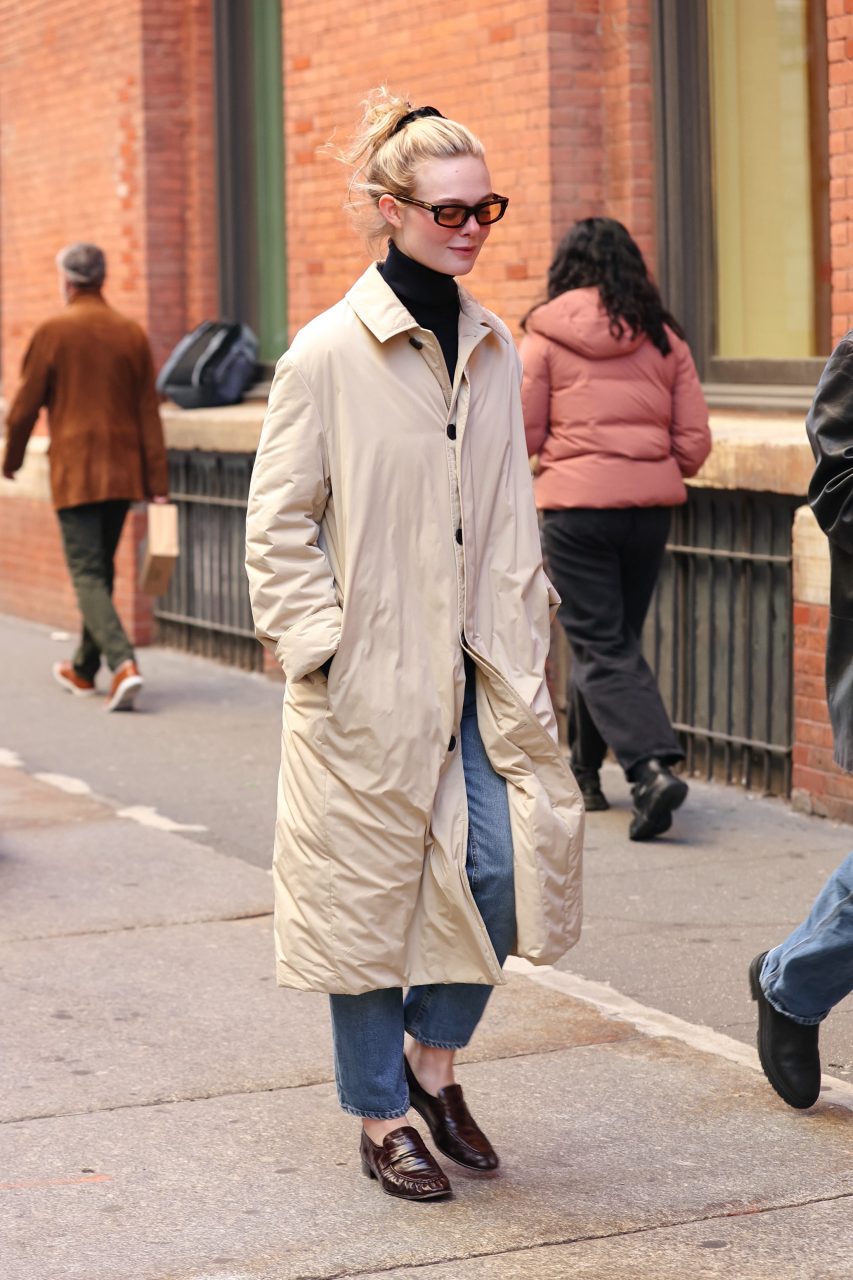 Elle Fanning用卡其色長款風衣內襯黑色高領內搭,下半身則配以淺藍色牛仔褲,酒紅色樂福鞋與啡色太陽眼鏡相映成趣,牛仔褲的加持為造型增加舒適感,和諧的色系和版型輪廓構成良好的視覺效果。