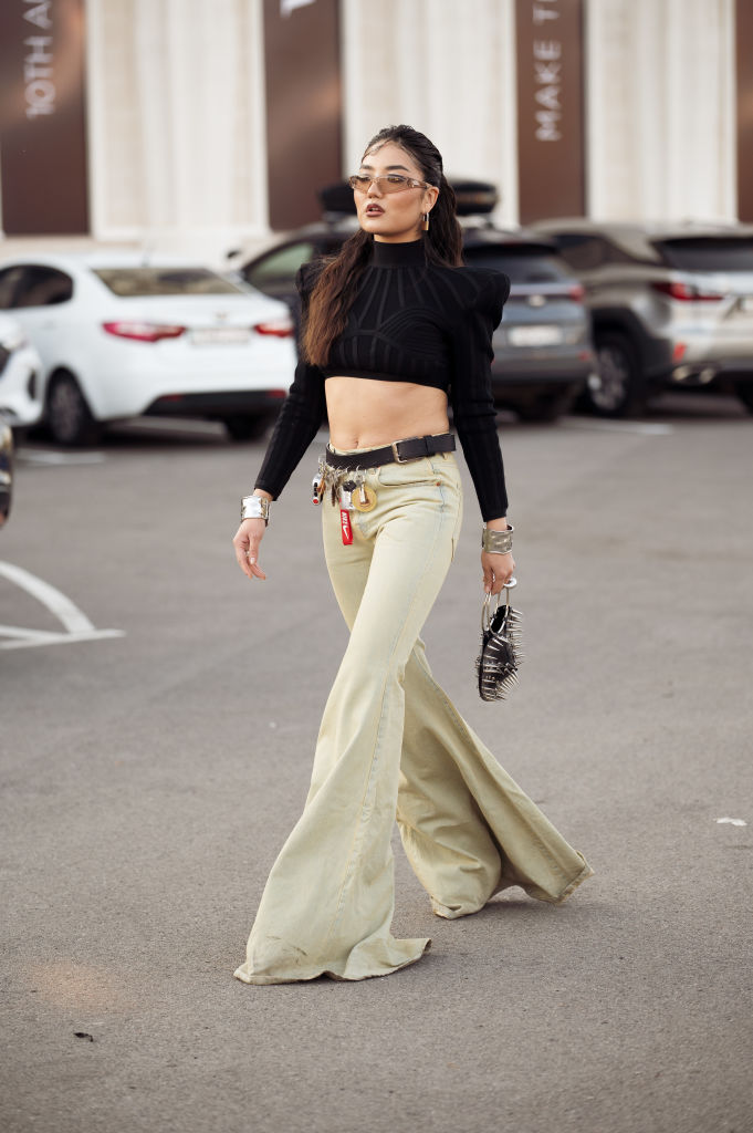 ALMATY, KAZAKHSTAN - OCTOBER 18: A guest wears wide pale green jeans, black long sleeve cropped top with elevated shoulders, heart shape bag with metal decorations and a black belt with keys as accessories during the 10th season of the Visa Fashion Week Almaty on October 18, 2024 in Almaty, Kazakhstan. (Photo by Raimonda Kulikauskiene/Getty Images)