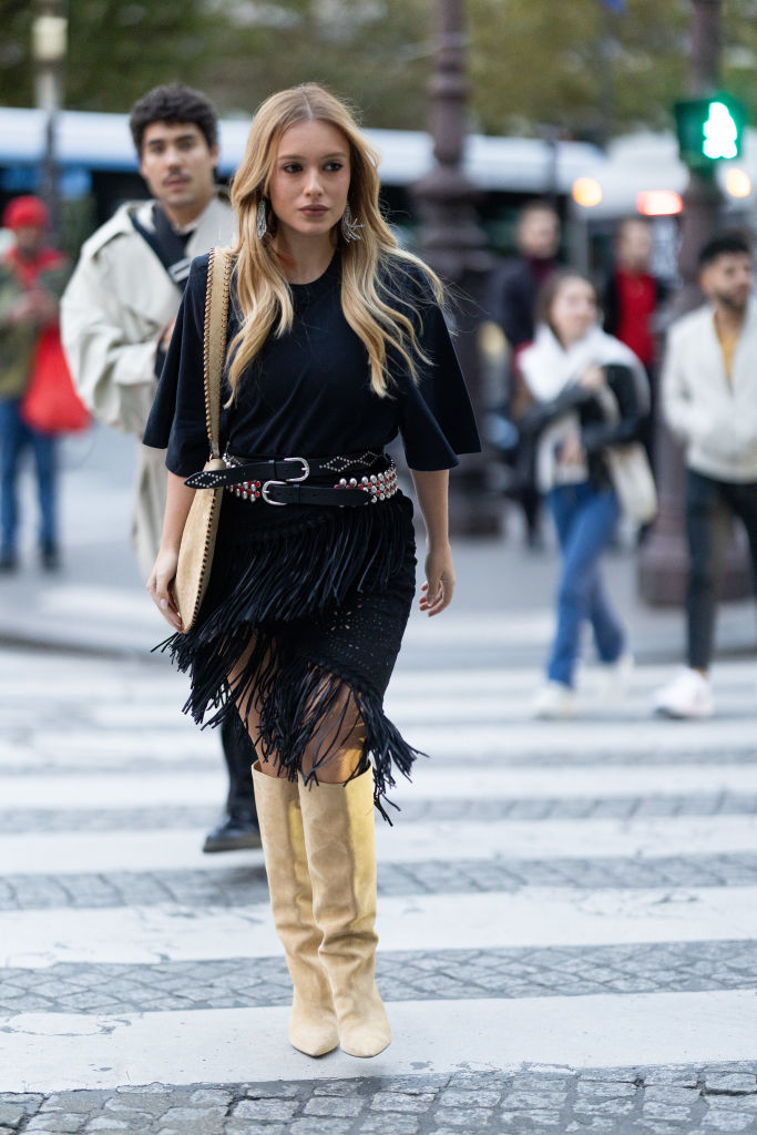 PARIS, FRANCE - SEPTEMBER 29: A guest wears beige knee high suede heeled boots, silver pendant earrings, a black t-shirt, black studded belts, a black skirt with fringes and a beige crossbody bag outside Isabel Marant show during Womenswear Spring/Summer 2025 as part of Paris Fashion Week on September 29, 2024 in Paris, France. (Photo by Valentina Frugiuele/Getty Images)