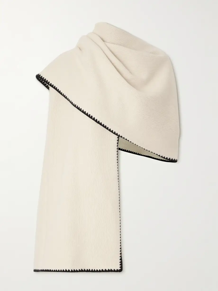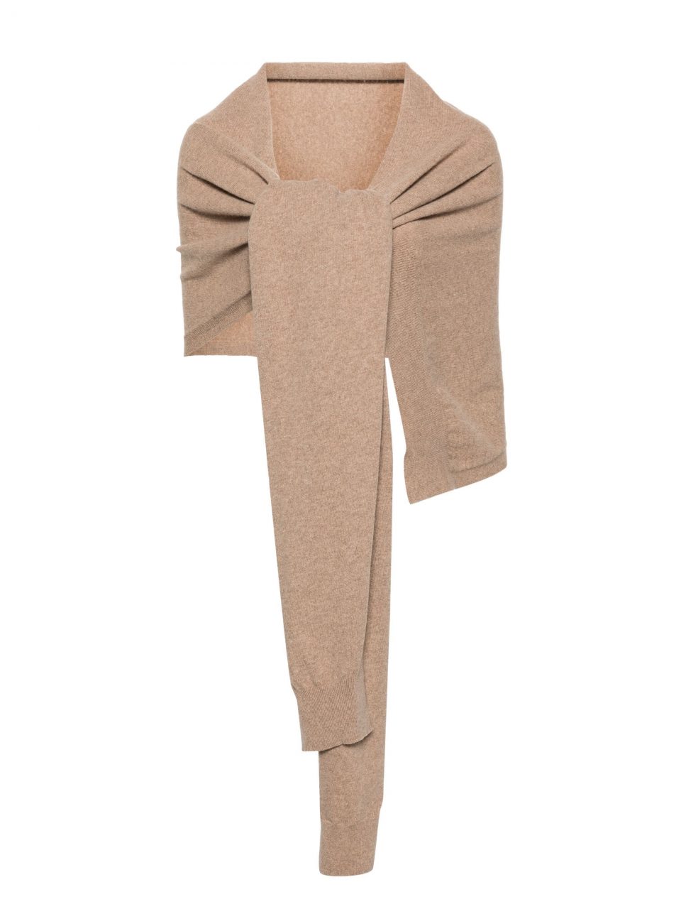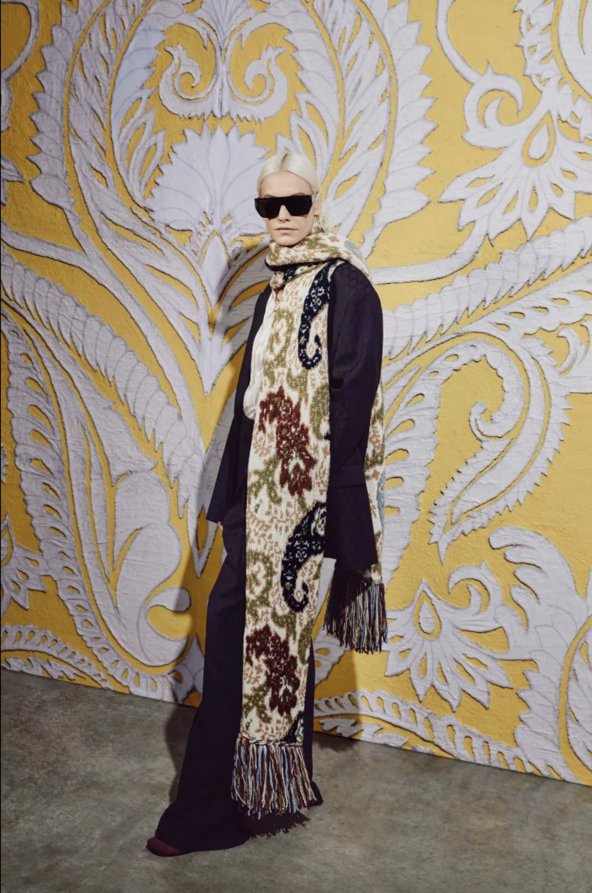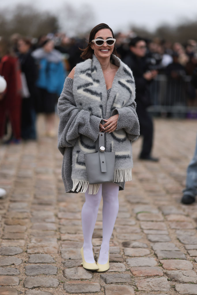 PARIS, FRANCE - MARCH 01: Karen Wazen guest was seen wearing beige shoes, white tights, a grey bag, beige shades, a grey pullover without fabric over her shoulders as well as a big loewe scarf before the Loewe Fashion Show during the Womenswear Fall/Winter 2024/2025 as part of  Paris Fashion Week on March 01, 2024 in Paris, France. (Photo by Jeremy Moeller/Getty Images)