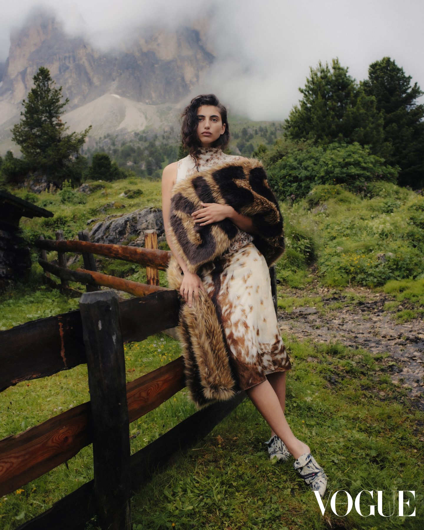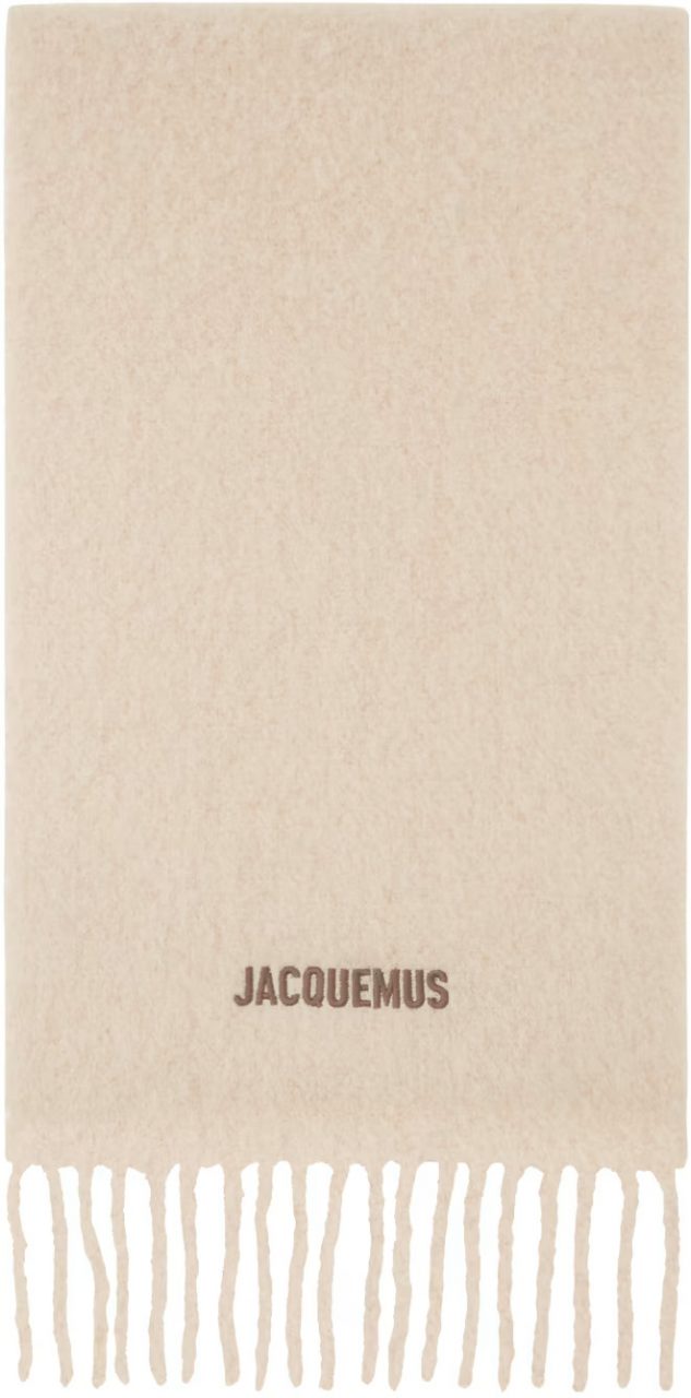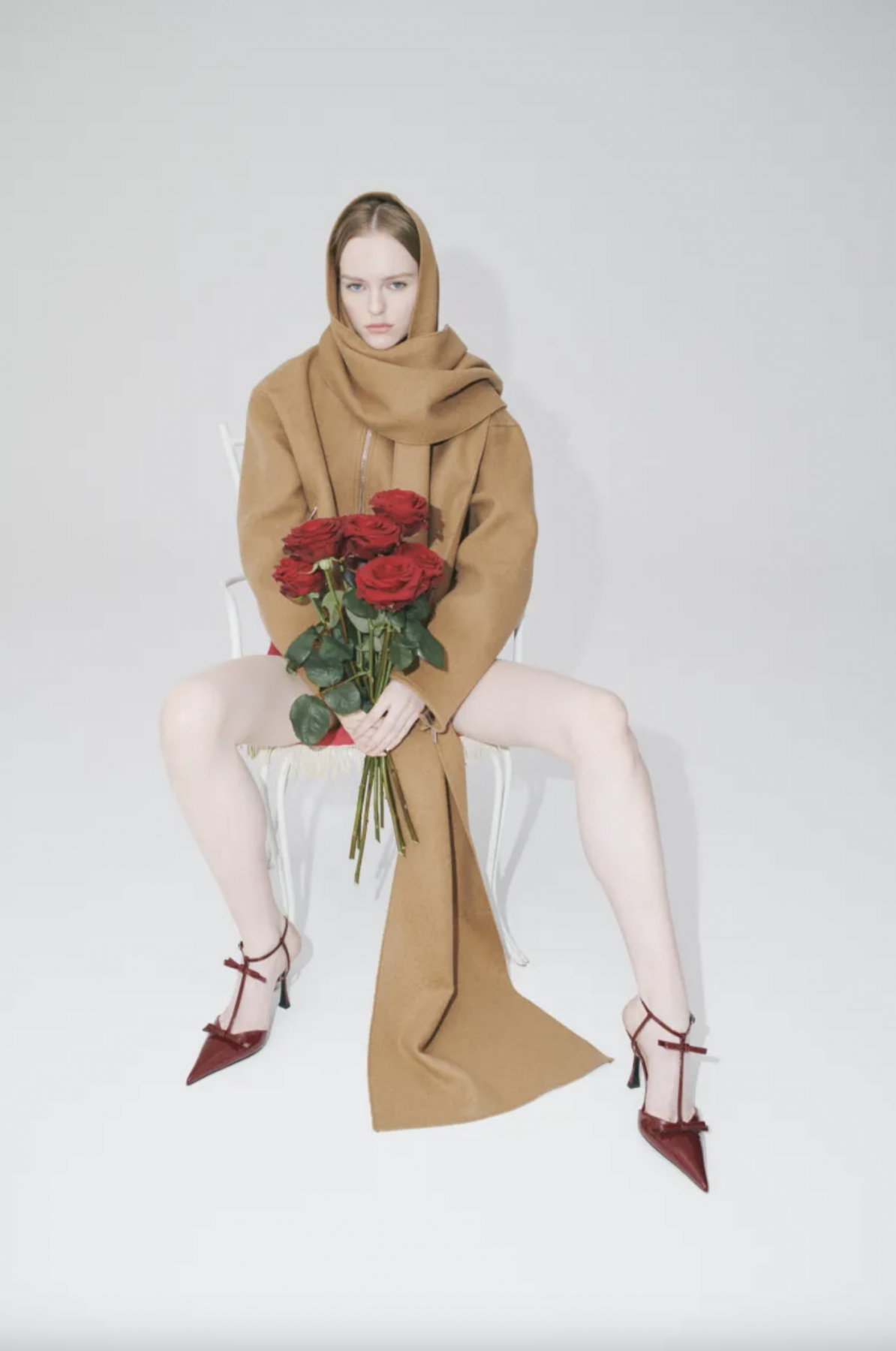 PARIS, FRANCE - MARCH 01: Karen Wazen guest was seen wearing beige shoes, white tights, a grey bag, beige shades, a grey pullover without fabric over her shoulders as well as a big loewe scarf before the Loewe Fashion Show during the Womenswear Fall/Winter 2024/2025 as part of  Paris Fashion Week on March 01, 2024 in Paris, France. (Photo by Jeremy Moeller/Getty Images)