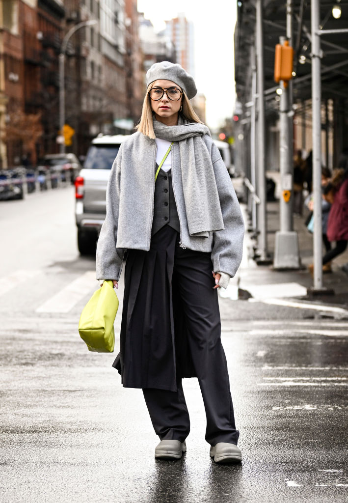 NEW YORK, NEW YORK - FEBRUARY 13: Olga Slobodianik is seen wearing a gray jacket, gray scarf, gray beret, black pants and lime green bag outside the Michael Kors show during NYFW F/W 2024 on February 13, 2024 in New York City. (Photo by Daniel Zuchnik/Getty Images)