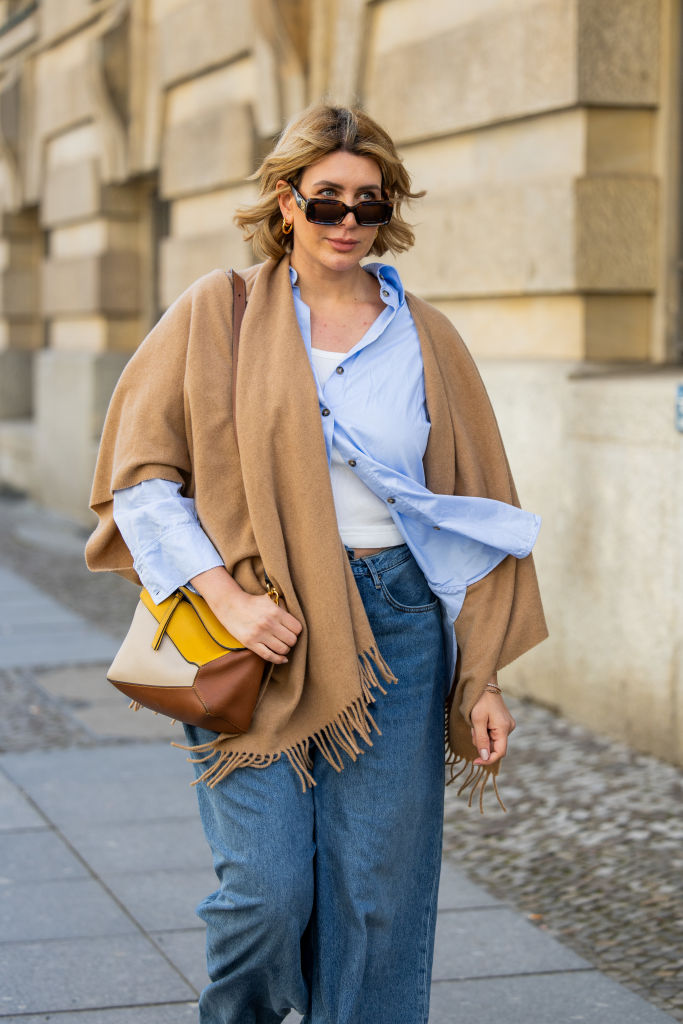 BERLIN, GERMANY - MAY 02: Victoria Scheu is seen wearing wide leg denim jeans COS, blue button shirt COS, brown/beige scarf Hallhuber, sunglasses Loewe, puzzle bag Loewe on May 02, 2024 in Berlin, Germany. (Photo by Christian Vierig/Getty Images)