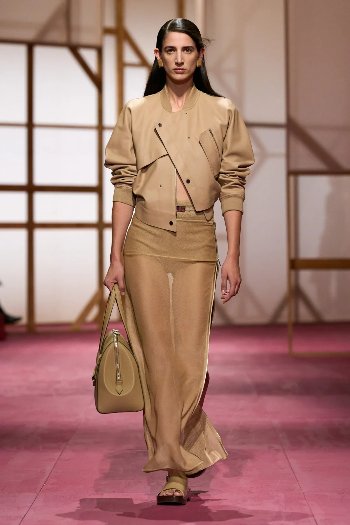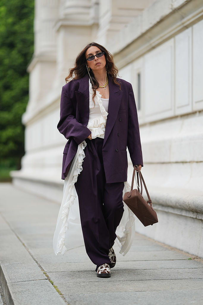 PARIS, FRANCE - APRIL 25: Gabriella Berdugo wears an oversized burgundy vintage suit by Courreges featuring a double-breasted blazer and relaxed-fit trousers, layered over a long ivory silk chiffon tunic shirt with ruffle trim by Chloe. Cow-print leather loafers by Jonak are paired with a structured brown suede handbag by Alaia. Rectangular black sunglasses and layered gold necklaces accessorize the outfit. Full body shot, during a street style fashion photo session, on April 25, 2025 in Paris, France. (Photo by Edward Berthelot/Getty Images)