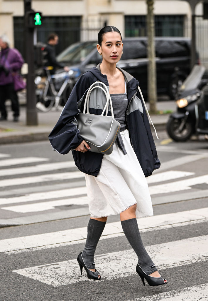 PARIS, FRANCE - MARCH 11: A guest is seen wearing a gray and black Miu Miu jacket, gray Miu Miu top, white skirt, gray Miu Miu socks and black shoes with Miu Miu gray bag outside the Miu Miu show during the Womenswear Fall/Winter 2025/2026 as part of Paris Fashion Week on March 11, 2025 in Paris, France. (Photo by Daniel Zuchnik/Getty Images)