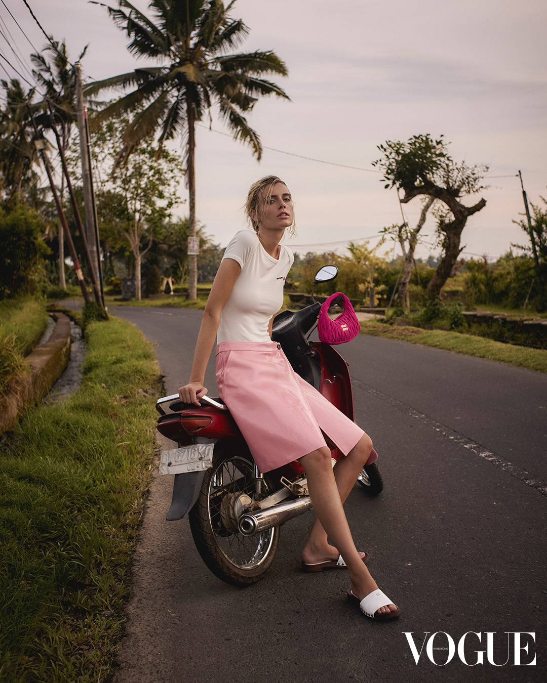 PARIS, FRANCE - MARCH 11: Leonie Hanne wears brown leather midi skirt, white top and brown suede jacket and dark brown bag with flower charms outside the Miu Miu fashion show during the Womenswear Fall/Winter 2025/2026 as part of Paris Fashion Week on March 11, 2025 in Paris, France. (Photo by Raimonda Kulikauskiene/Getty Images)