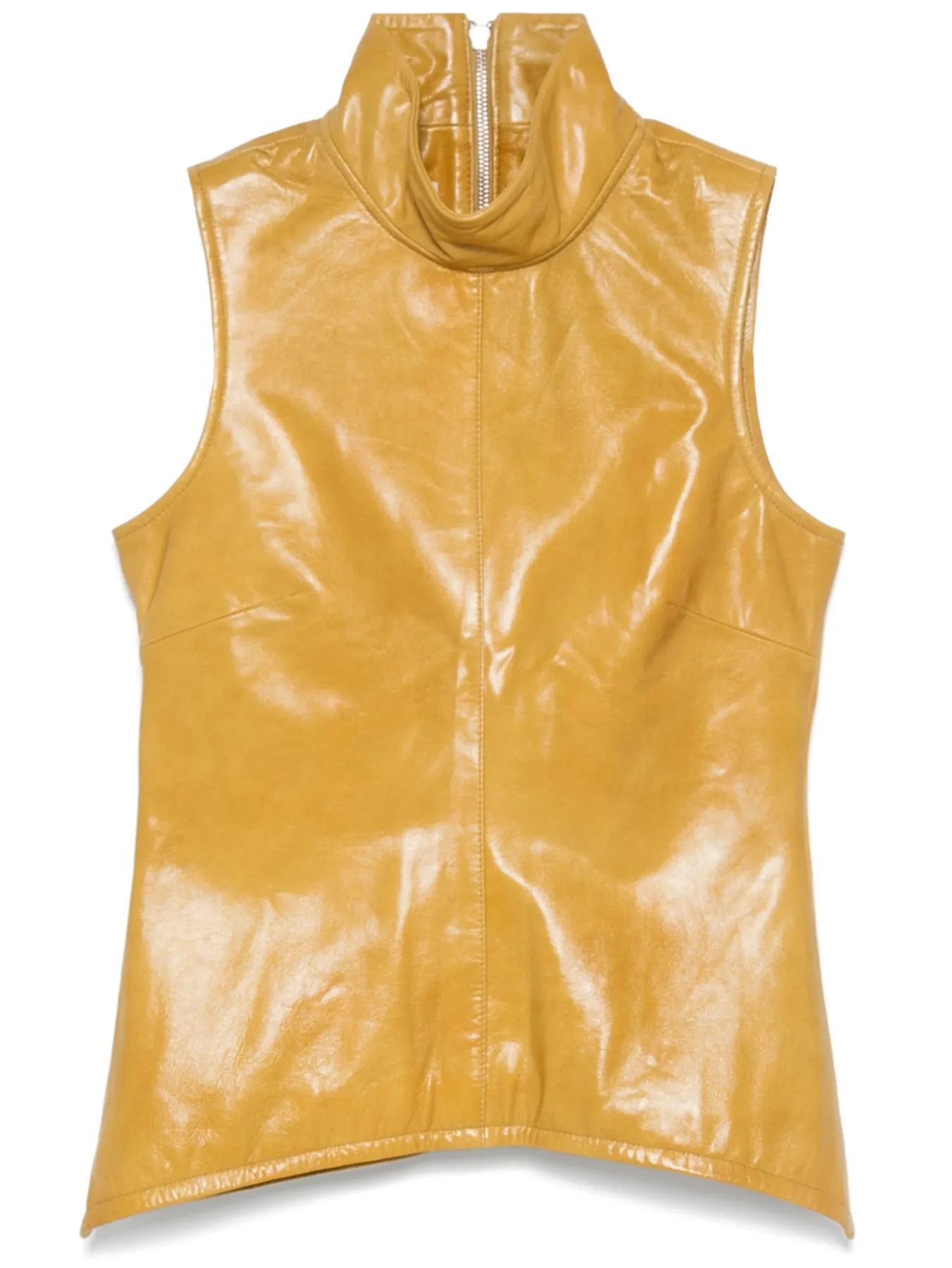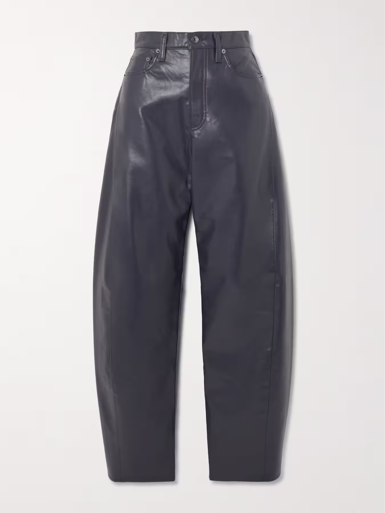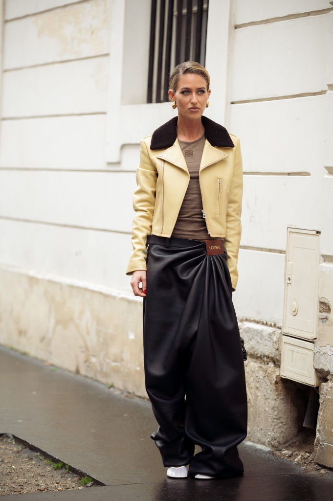 PARIS, FRANCE - MARCH 10: Emili Sindlev wears black wide Loewe leather pants, brown top, pale yellow leather jacket with black collar, white high heels and black Loewe bag outside the LOEWE presentation during the Womenswear Fall/Winter 2025/2026 as part of Paris Fashion Week on March 10, 2025 in Paris, France. (Photo by Raimonda Kulikauskiene/Getty Images)