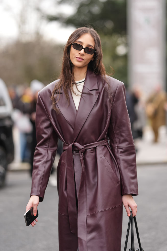 PARIS, FRANCE - MARCH 10: Yasmin Wijnaldum wears black sunglasses, white t-shirt, burgundy bordeaux belted leather trench coat, outside Zimmermann, during the Paris Fashion week Women's Fall/Winter 2025-2026 on March 10, 2025 in Paris, France. (Photo by Edward Berthelot/Getty Images)