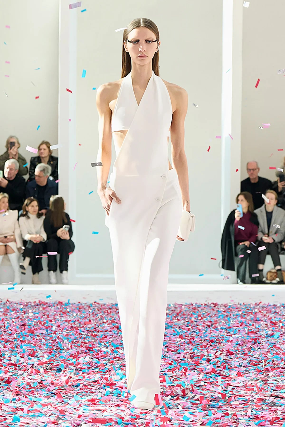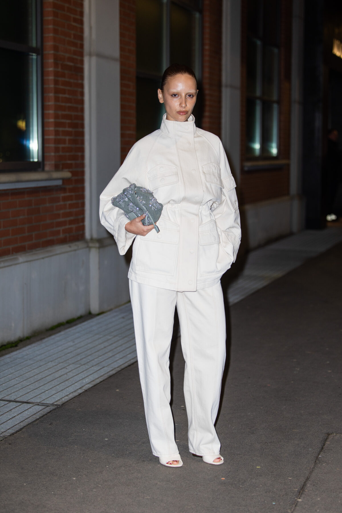 MILAN, ITALY - FEBRUARY 26: Marie Gaguech wears white jacket, pants, blue bag outside Fendi during the Milan Fashion Week Womenswear Fall/Winter 2025/2026 on February 26, 2025 in Milan, Italy. (Photo by Christian Vierig/Getty Images)