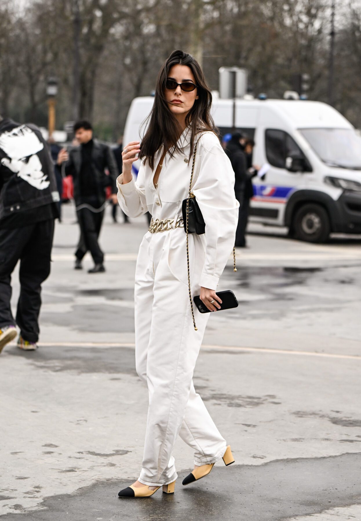 PARIS, FRANCE - MARCH 11: A guest is seen wearing a white Chanel outfit, black and tan Chanel shoes, Chanel belt, black and gold Chanel bag and black sunglasses outside the Chanel show during the Womenswear Fall/Winter 2025/2026 as part of Paris Fashion Week on March 11, 2025 in Paris, France. (Photo by Daniel Zuchnik/Getty Images)
