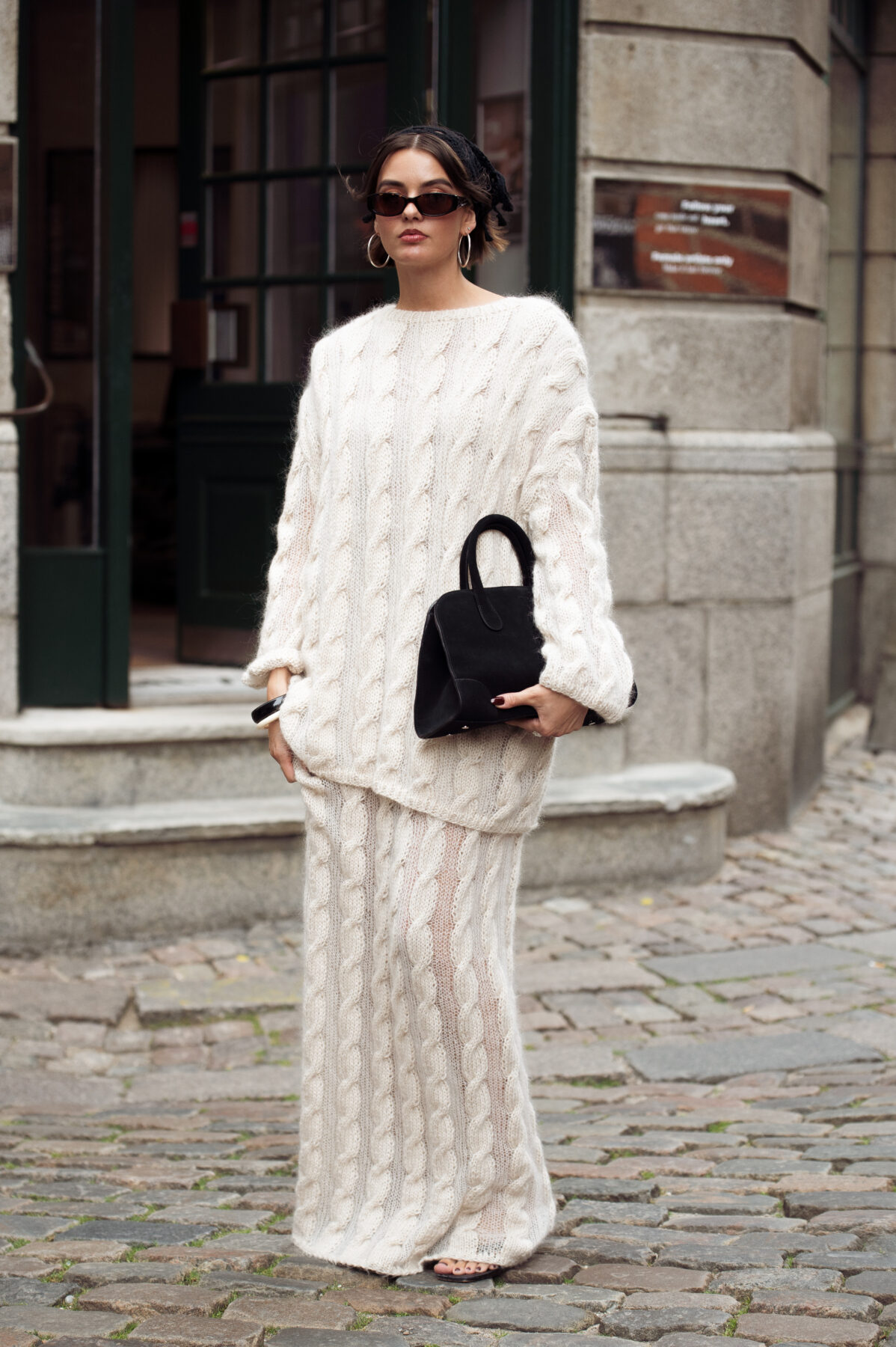 COPENHAGEN, DENMARK - AUGUST 04: A guest wears white knitted maxi skirt, matching sweater, black head scarf and black bag outside Freya Dalsjo show during Copenhagen Fashion Week day one on August 04, 2025 in Copenhagen, Denmark. (Photo by Raimonda Kulikauskiene/Getty Images)