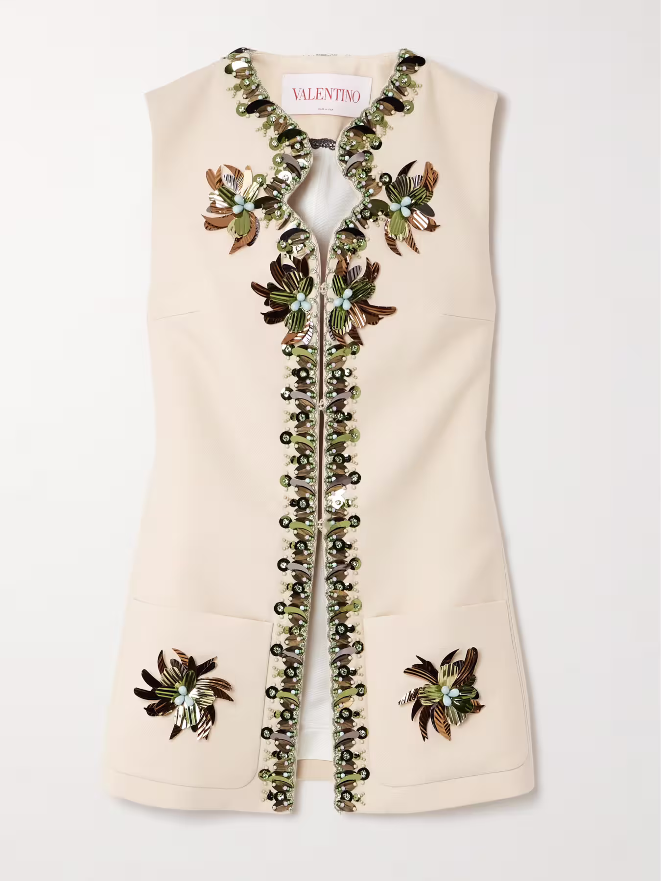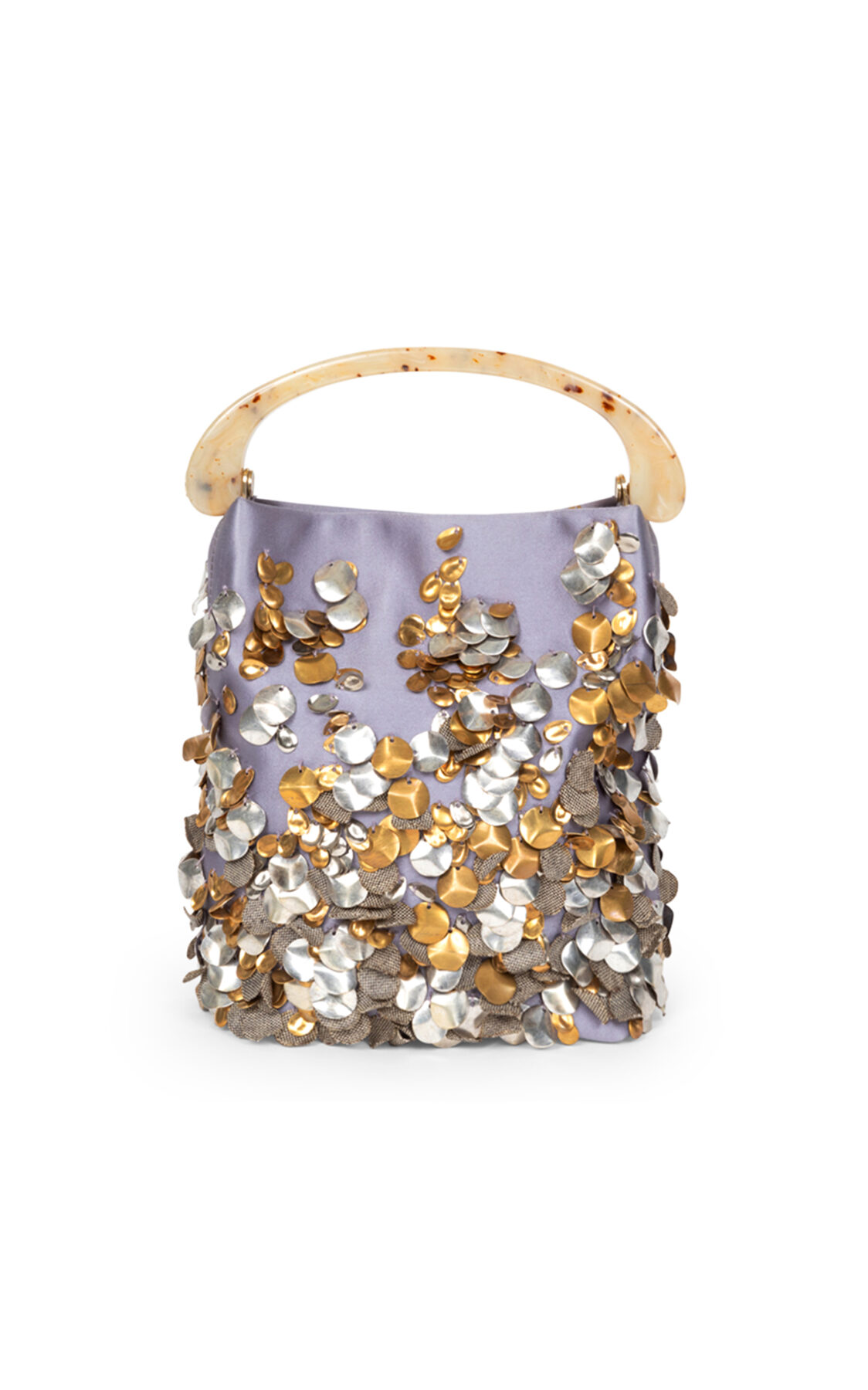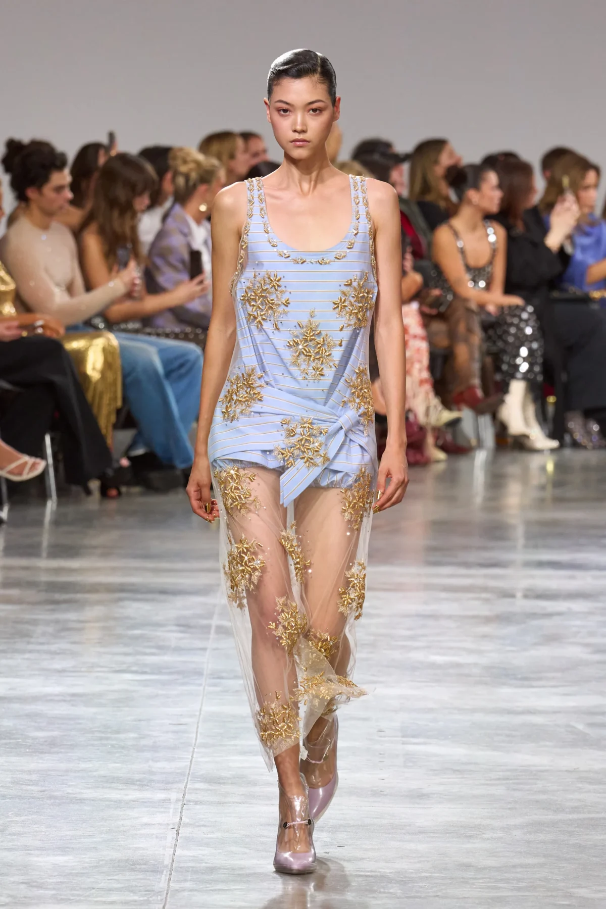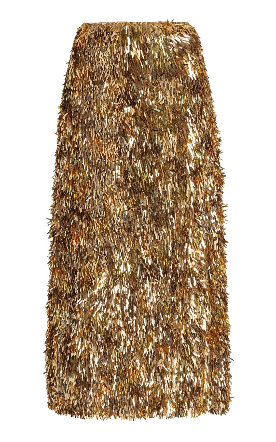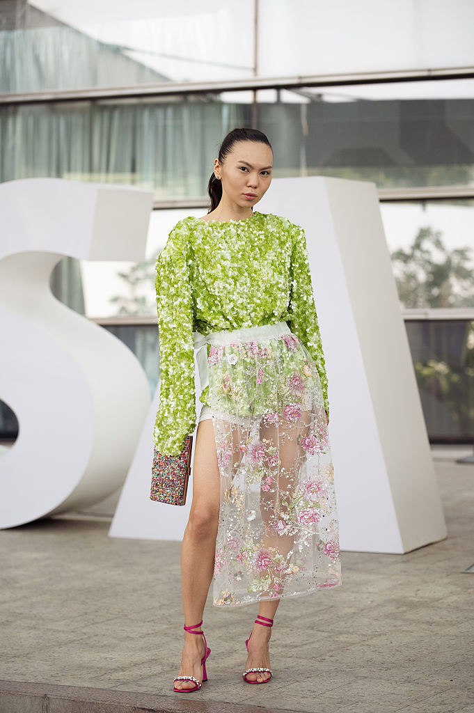 ALMATY, KAZAKHSTAN - MAY 04: Daiana Argimbayeva wears green sequent long sleeve top, sheer embroidered skirt and embroidered with beads colourful clutch during day 2 of Visa Fashion Week Almaty 2025 on May 04, 2025 in Almaty, Kazakhstan. (Photo by Raimonda Kulikauskiene/Getty Images)