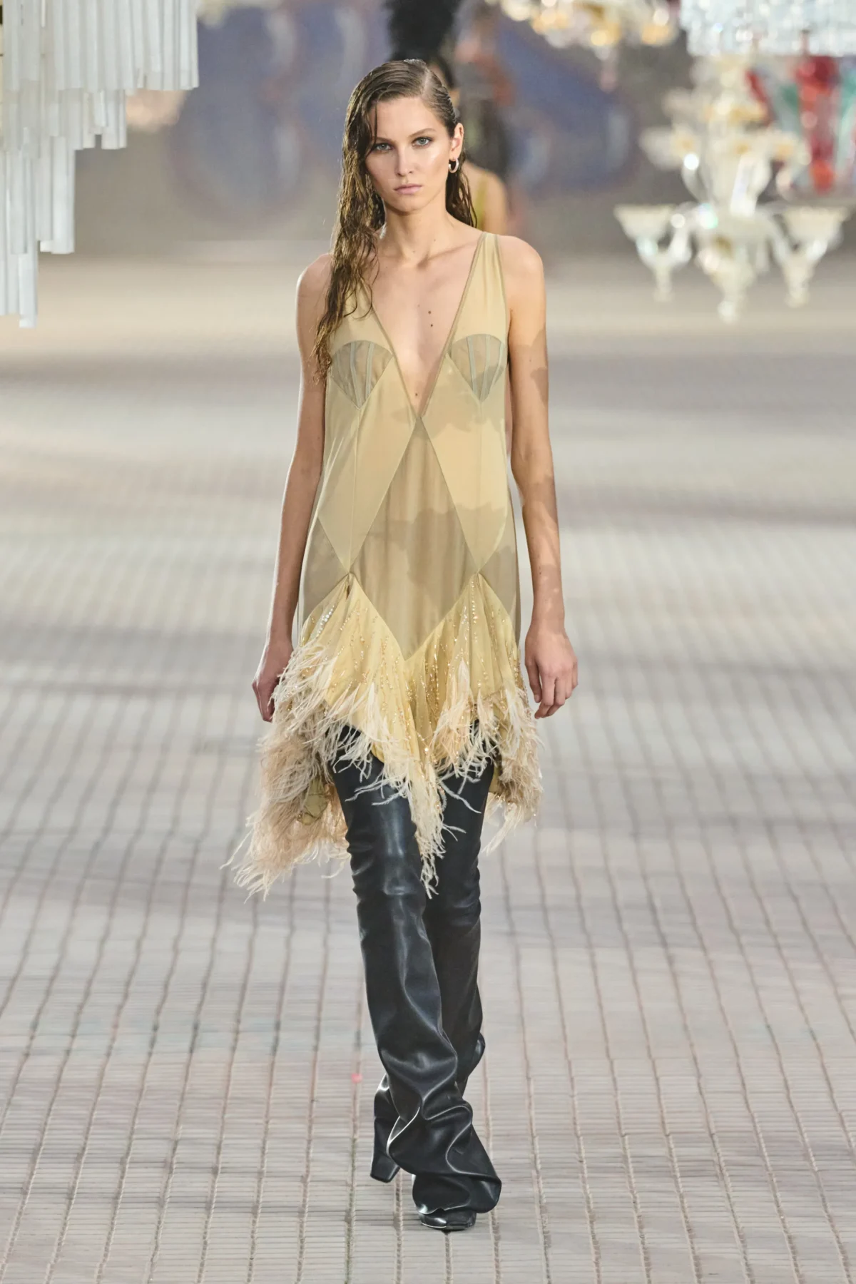 PARIS, FRANCE - MARCH 08: A guest wears white decorated jacket, yellow lace midi skirt, nude bag and heels, outside Georges Hobeika, during the Womenswear Fall/Winter 2025/2026 as part of Paris Fashion Week on March 08, 2025 in Paris, France. (Photo by Claudio Lavenia/Getty Images)