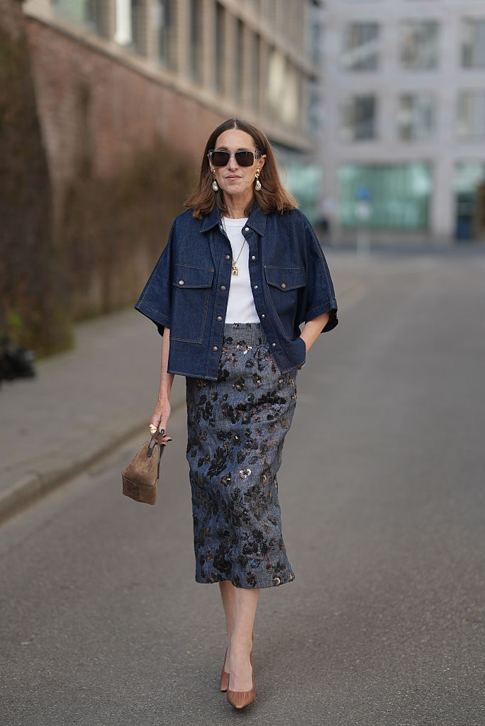 MUNICH, GERMANY - APRIL 16: Annette Weber is seen wearing a dark blue jeans blouse with short sleeves and chest pockets from Agolde, a blue linen blend with flower sequin embroidery LUDMILLA maxi skirt from T&t Stories, a ripped white basic tanktop from Citizens of Humanity, Emmanuelle 110 satin pumps in cappuccino brown with pointed toe from Saint Laurent, a BC Duo mini bag in suede with monili in bark from Brunello Cuccinelli, a golden necklace with elephant pendant from Ole Lynggaard, sunglasses with transparent frame from Azzedine Alaïa, drop shaped pearl earrings with golden studs on April 16, 2025 in Munich, Germany. (Photo by Moritz Scholz/Getty Images)