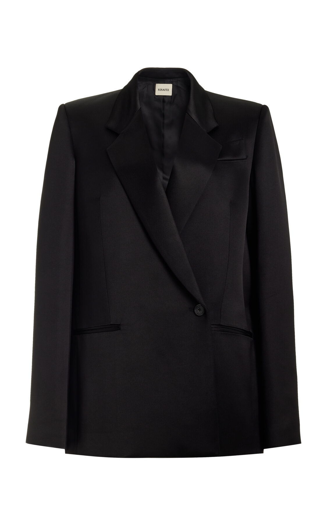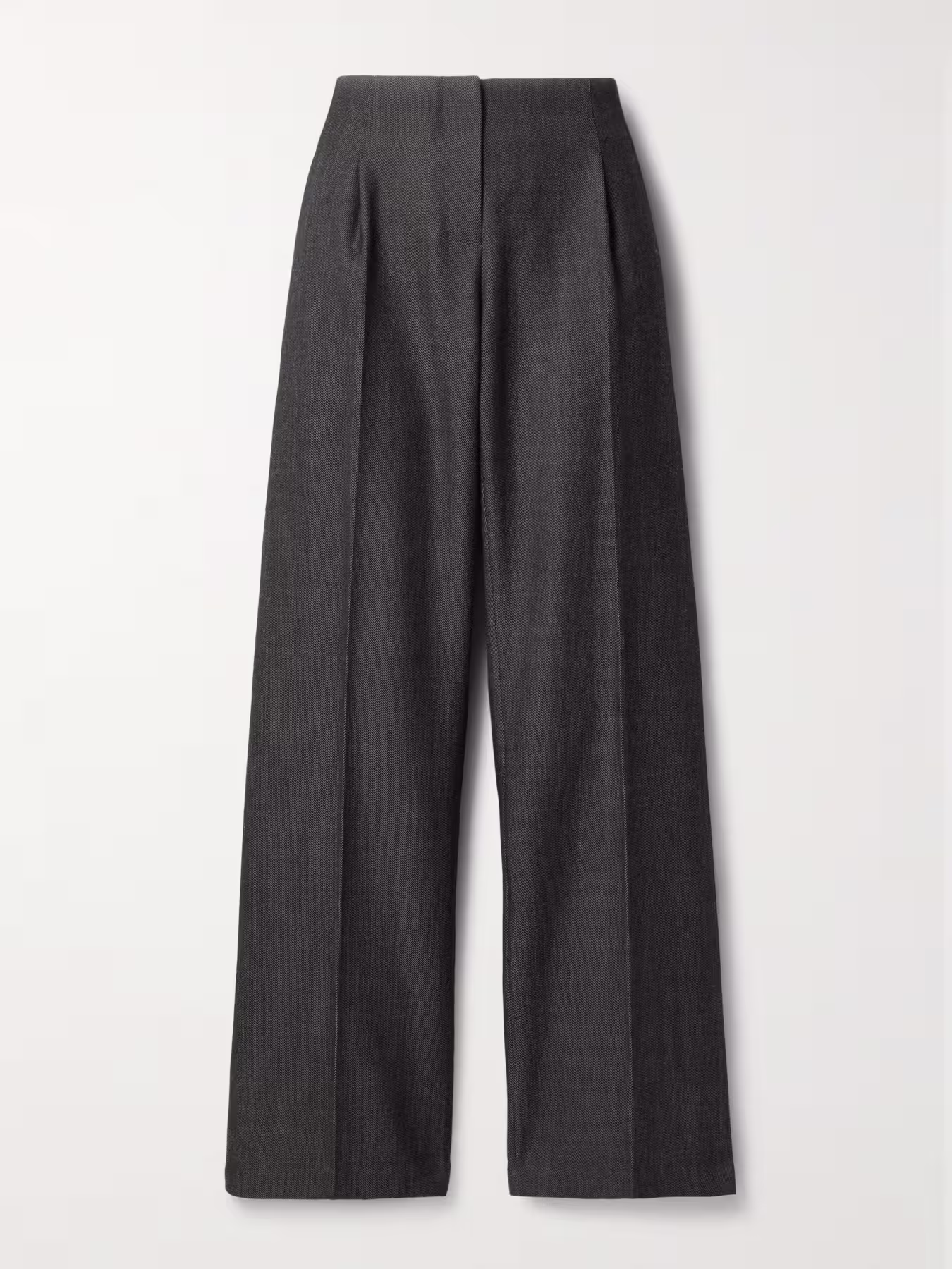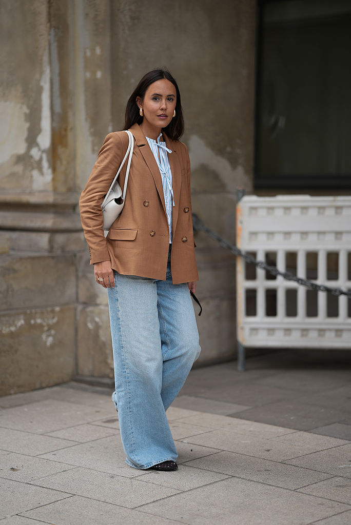 HAMBURG, GERMANY - MAY 7: Laura Noltemeyer is seen wearing a light indigo blue wide leg jeans from Agolde, a double-breasted suit jacket in hazelnut brown from Sézane, a cotton puff sleeve blouse with ties in the front in white with blue stripes from Sézane, black woven leather THEA MARY JANE ballet shoes from Stuart Weitzman, Arco handbag in white intrecciato leather from Bottega Veneta, big golden drop-shaped earrings, stacked golden rings from Cartier on May 7, 2025 in Hamburg, Germany. (Photo by Moritz Scholz/Getty Images)