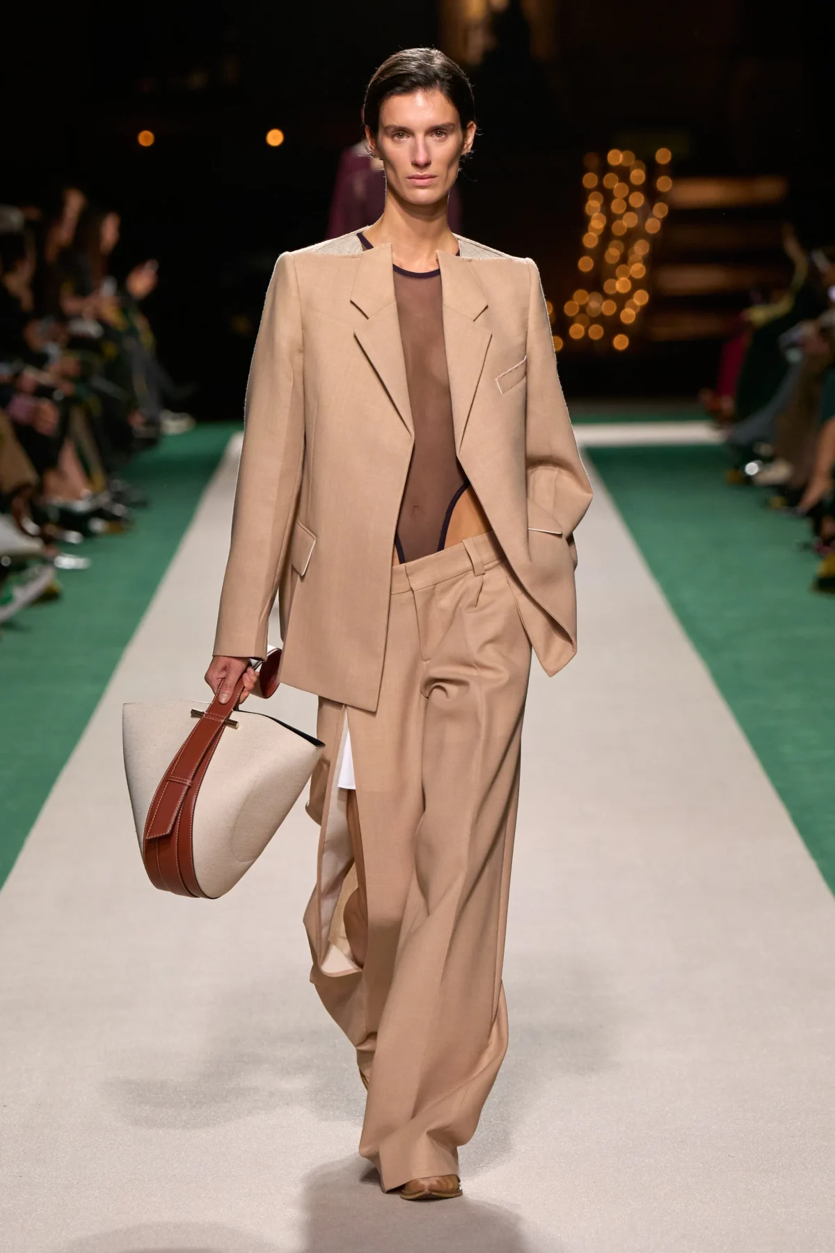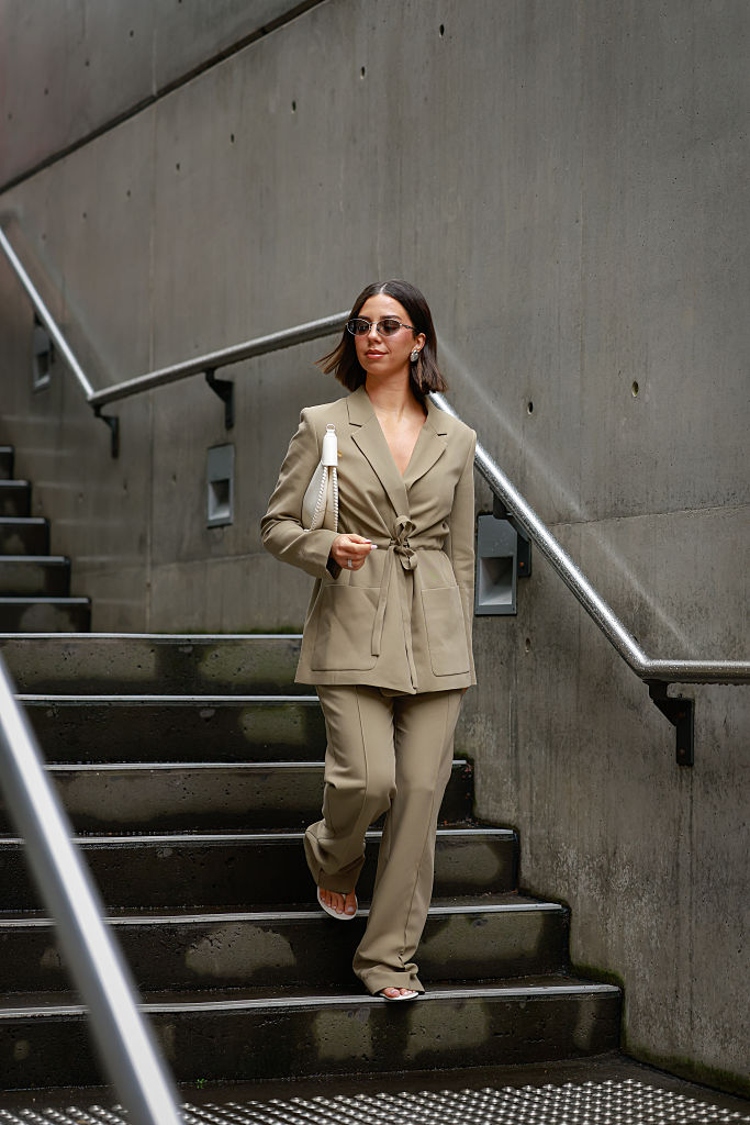 SYDNEY, AUSTRALIA - MAY 15: Jessica Abdilla wearing white Charles & Keith boho bag and white Charles & Keith Sculptural-heel thong sandals, beige suit outside Hansen & Gretel show during Australian Fashion Week 2025 on May 15, 2025 in Sydney, Australia. (Photo by Hanna Lassen/Getty Images)