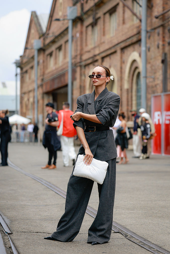 SYDNEY, AUSTRALIA - MAY 15: Bella Varelis wearing Bec & Bridge grey suit and white Dior clutch wearing during Australian Fashion Week 2025 on May 15, 2025 in Sydney, Australia. (Photo by Hanna Lassen/Getty Images)
