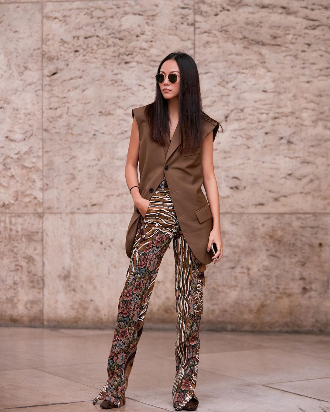 最近,我們在全球範圍都稱得上風向標的Blackpink Jennie的日常搭配中也看見了這樣的穿法,修身的馬甲穿做上衣,能良好地修飾身材,甚至背心部份就是為遮蓋多餘的副乳而設計。像Jennie一樣搭配同色系西褲,和白色波鞋,型格又清爽。
