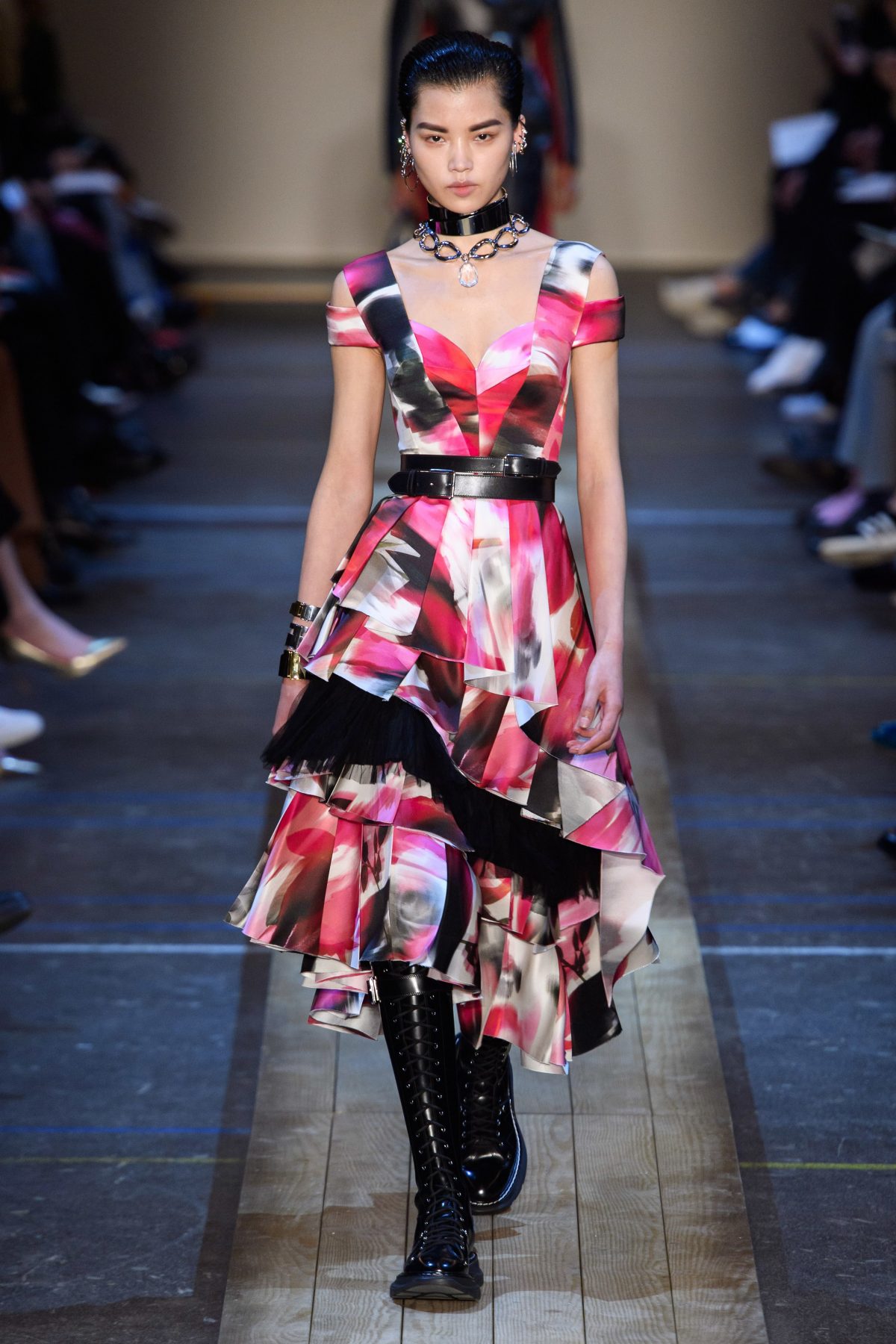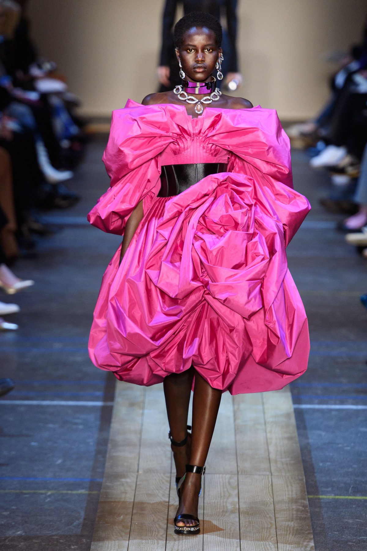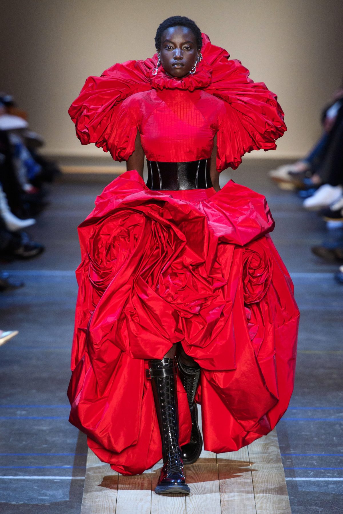 Sarah Burton的2019秋冬系列被譽為是她接任創作總監後表現最好的一季。那些破碎的細節、硬朗的男裝輪廓、還有皮革製成的胸衣、維多利亞風格裙裝上綻放的玫瑰都展示出了McQueen的暗黑浪漫。Sarah Burton更帶她的團隊重回她的家鄉英國北部城市Macclesfield尋找英國紡織品的傳統和文化。不得不提的是該系列的壓軸亦是本期封面Adwoa所穿的紅色禮服基本上等同於高級訂製的工藝,那是在外界環境及壓力下仍然綻放的英倫玫瑰。