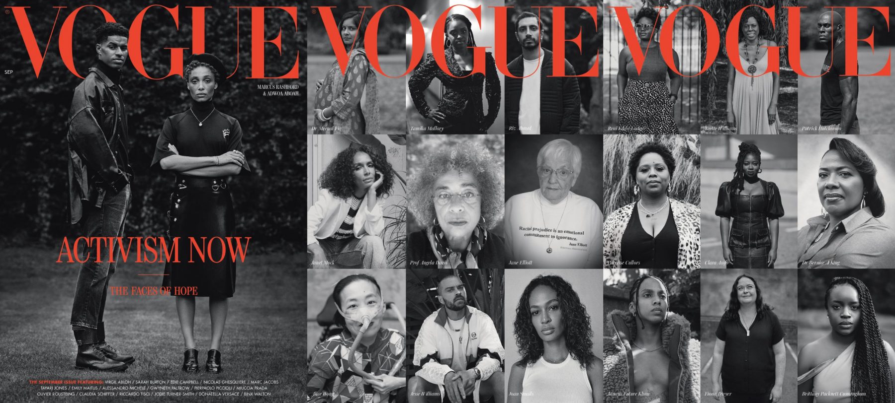 British Vogue featuring Marcus Rashford and Adwoa Aboah. Inside cover, top row: Dr Meenal Viz, Tamika Mallory, Riz Ahmed, Reni Eddo-Lodge, Yvette Williams, Patrick Hutchinson; Middle row, from left: Janet Mock, Prof Angela Davis, Jane Elliott, Patrisse Cullors, Clara Amfo, Dr Bernice A King; Bottom row, from left: Alice Wong, Jesse Williams, Joan Smalls, Janaya Future Khan, Fiona Dwyer, Brittany Packnett Cunningham. Photographs: Reginald Cunningham, Philip-Daniel Ducasse, Misan Harriman, Eddie Hernandez, Texas Isaiah, Chrisean Rose