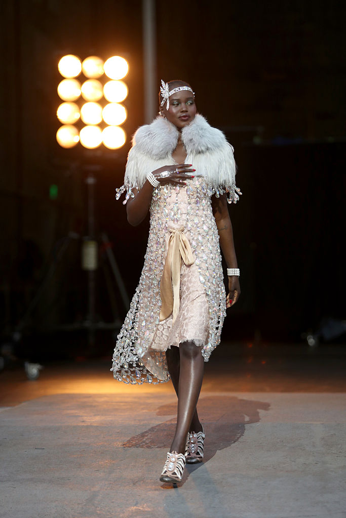 在向 Jessica Rabbit 致敬的驚鴻一瞥後,Kendall Jenner 身著 Nicole Kidman 於 2001 年《情陷紅磨坊》中演唱 <Diamonds Are a Girl’s Best Friend> 時的原版戲服驚艷登場。前排為她歡呼的嘉賓雲集,從設計師 Aurora James、新科奧斯卡得主 Da’Vine Joy Randolph,到傳奇戲服設計師 Ruth E. Carter 皆在列。