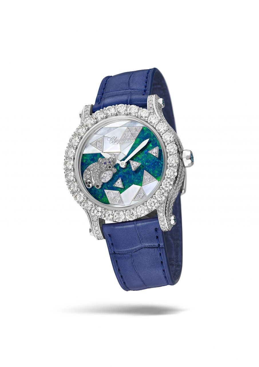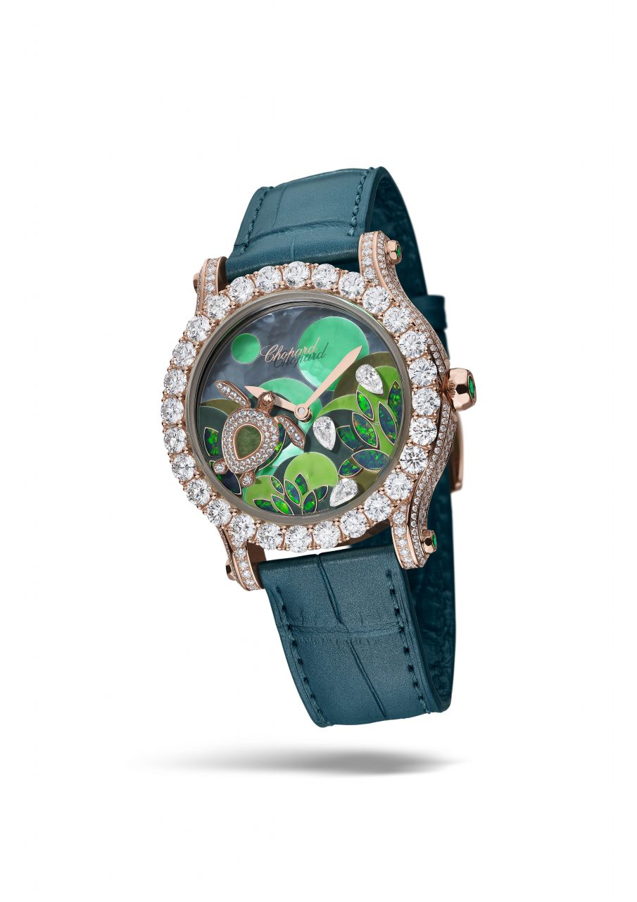 在海洋中生息已有 2.25 億年之久的海龜由於海灘的發展、氣候變化和海洋污染等問題,導致數量急劇下降。而海龜的美麗紋理龜甲成為了品牌靈感,以鑲嵌鑽石的凸圓形切割天然砂金石演繹,而且能夠悠然自得地在錶盤上緩緩移動;錶盤裏的海底世界以珍珠貝母和綠色歐泊組成的珊瑚株枝椏縱橫交錯,引人入勝。