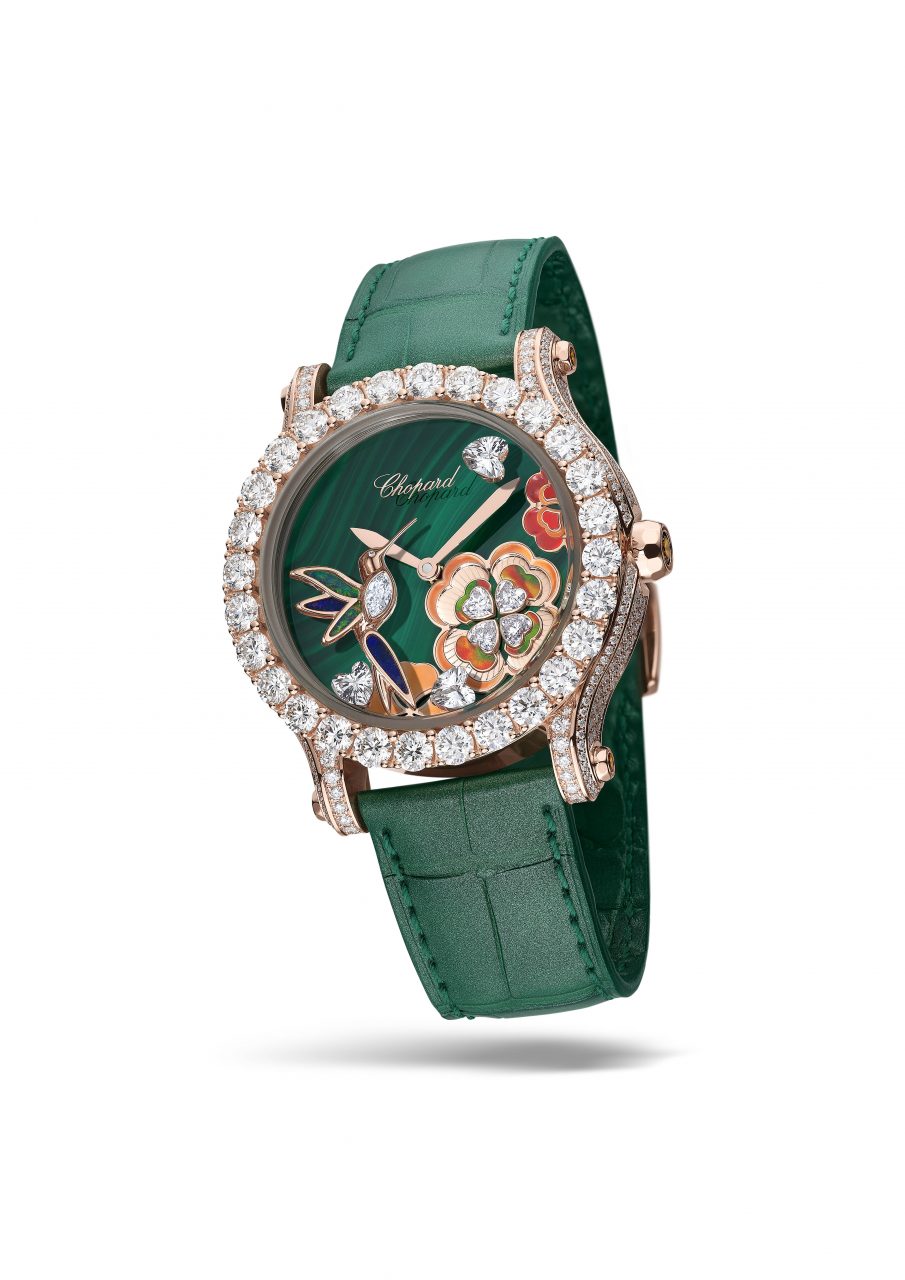蜂鳥是世界上體型最小的候鳥,然而,隨著孕育蜂鳥的自然棲息地遭到破壞,蜂鳥成為特別易受氣候變化和濫伐樹木影響的動物。為此,品牌把錶盤設定為蜂鳥賴以生存的亞馬遜叢林,在孔雀石背景上,四片不同厚度的金質、橙色、紅色及漸變珍珠貝母演繹色彩,同時以碎片鑲拼出華美的木槿花,花蕊由四顆心形切割鑽石組成,而三顆心形活動鑽石也自在舞動,閃耀光芒。