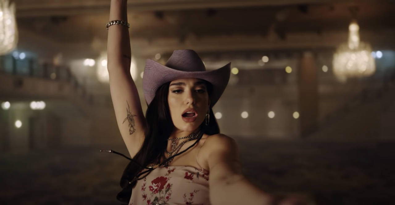 最新釋出的《Love Again》 MV 中,Dua Lipa 以一身 #Ranchcore 造型亮相,她換上了斑馬比堅尼上衣及馬甲外套,搭配著牛仔帽,並騎在電動公牛上舞動。