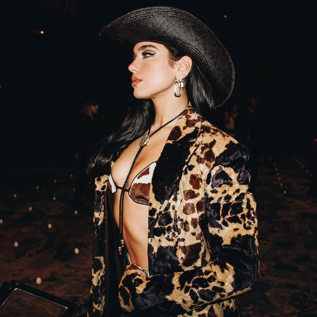 最新釋出的《Love Again》 MV 中,Dua Lipa 以一身 #Ranchcore 造型亮相,她換上了斑馬比堅尼上衣及馬甲外套,搭配著牛仔帽,並騎在電動公牛上舞動。
