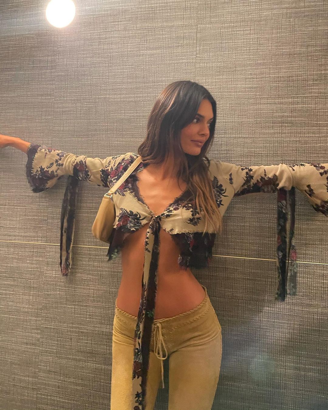 接著的 2月, Bella Hadid 在也穿上了一條來自設計師品牌 Charlotte Knowles 所設計的「子彈褲」(Bullet pants)。這條啡色皮革長褲綴有很銀色小孔,上面繫著綠色細繩,來自是設計師 Charlotte Knowles 2020 年秋冬系列的作品。