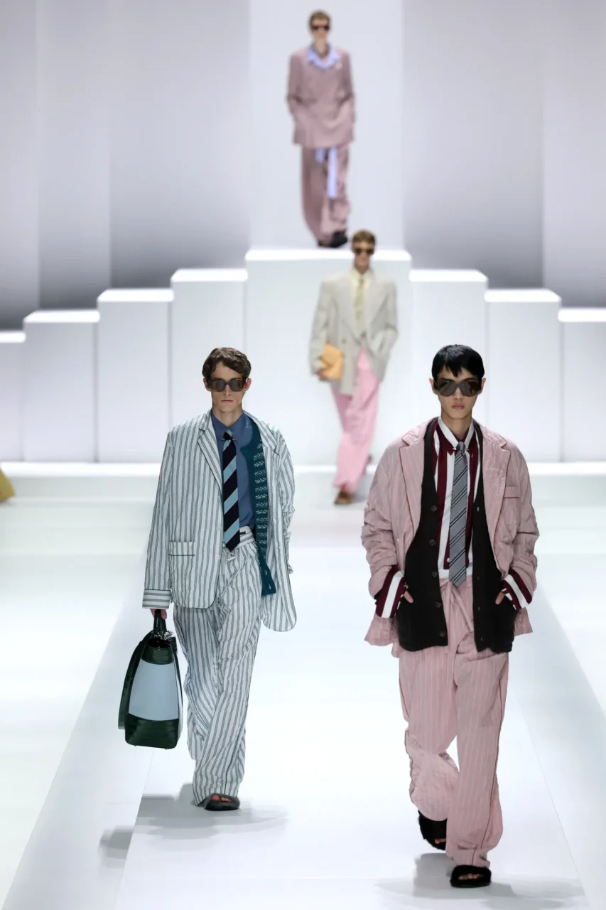 同時,在Emporio Armani和Giorgio Armani的時裝展上,除去結構感的訂製西裝成為主流,睡衣的靈感體現在一些綁帶外套上,帶來無與倫比的舒適感。