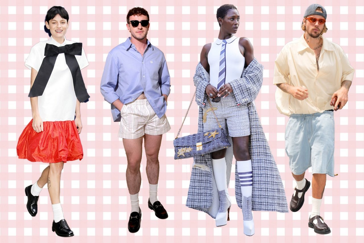 撇開 Z 世代的偏好不談,一群時尚名人最近也加入了這款白襪子的提案。今年夏天,時髦的正裝鞋和白色圓襪已成為了 Emma Corrin、Paul Mescal 和 Justin Bieber 等明星的製服。