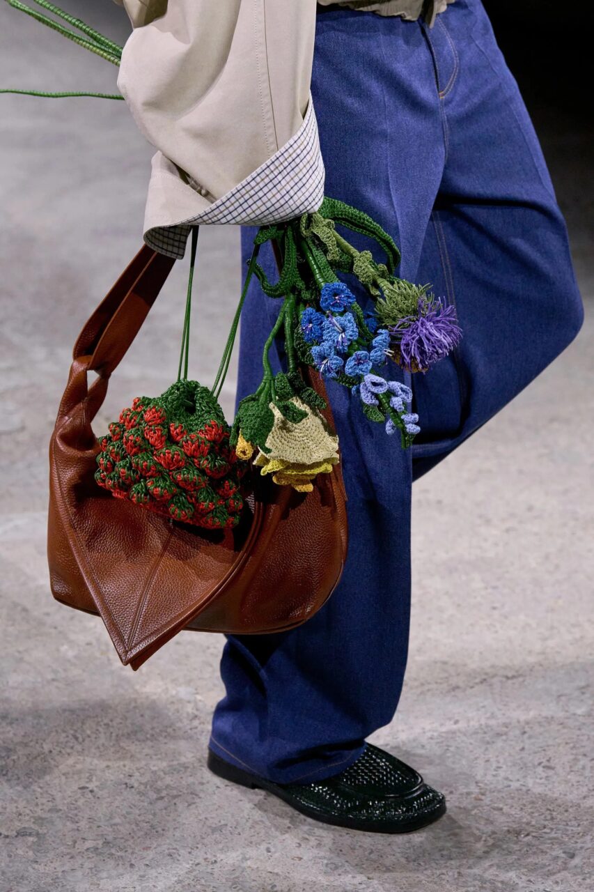 Bottega Veneta 在 2025 春夏系列時裝展上更進一步,推出了以花束為靈感的配飾設計:包裹花束的紙張不再是普通的紙,而是用皮革打造,花朵則以編織技術製成。彷彿攜帶一束花已成為最潮的表現,一種被提升為不可或缺的時尚配飾。