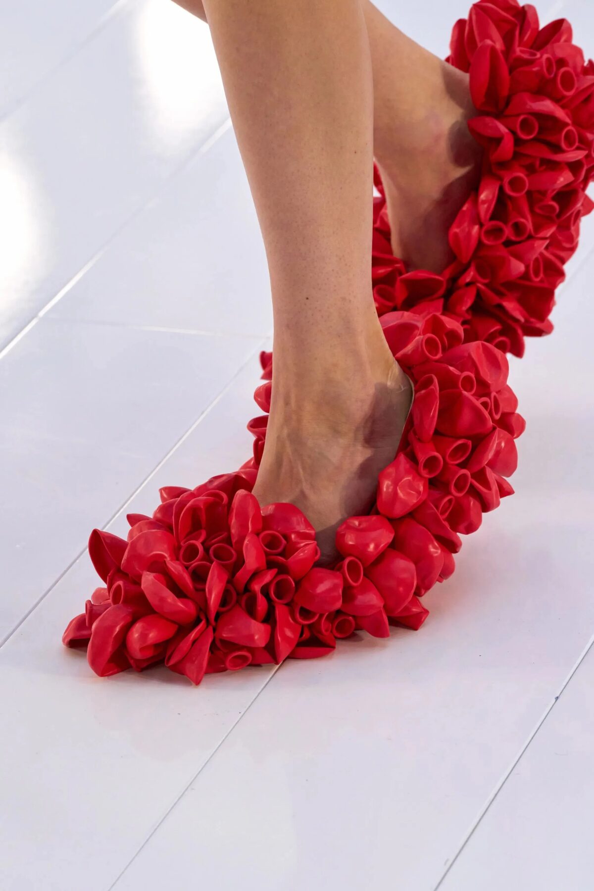 提到時尚中對日常物品的改造,怎能不提兩位大師——Jonathan Anderson 和 Moschino?Jonathan Anderson,來自英國的設計師,自 2015 春夏系列首次為 Loewe 操刀後,便憑藉其充滿野心的前瞻性視野與無限創造力,帶領品牌大放異彩。在每一季的作品中,他展現出將日常物品轉化為極致時尚單品的驚人能力:從改造為高跟鞋的唇膏和固體香皂,到用數百個氣球製作的高跟鞋,再到將一朵美麗的火鶴花變成別具一格的上衣。這些風格獨特的作品不僅迅速征服時尚圈,更超越時尚界限,成為文化現象。像 Kylie Jenner、Emily Ratajkowski 和 Beyoncé 等名人,都紛紛愛上了他這些顛覆傳統的創作。