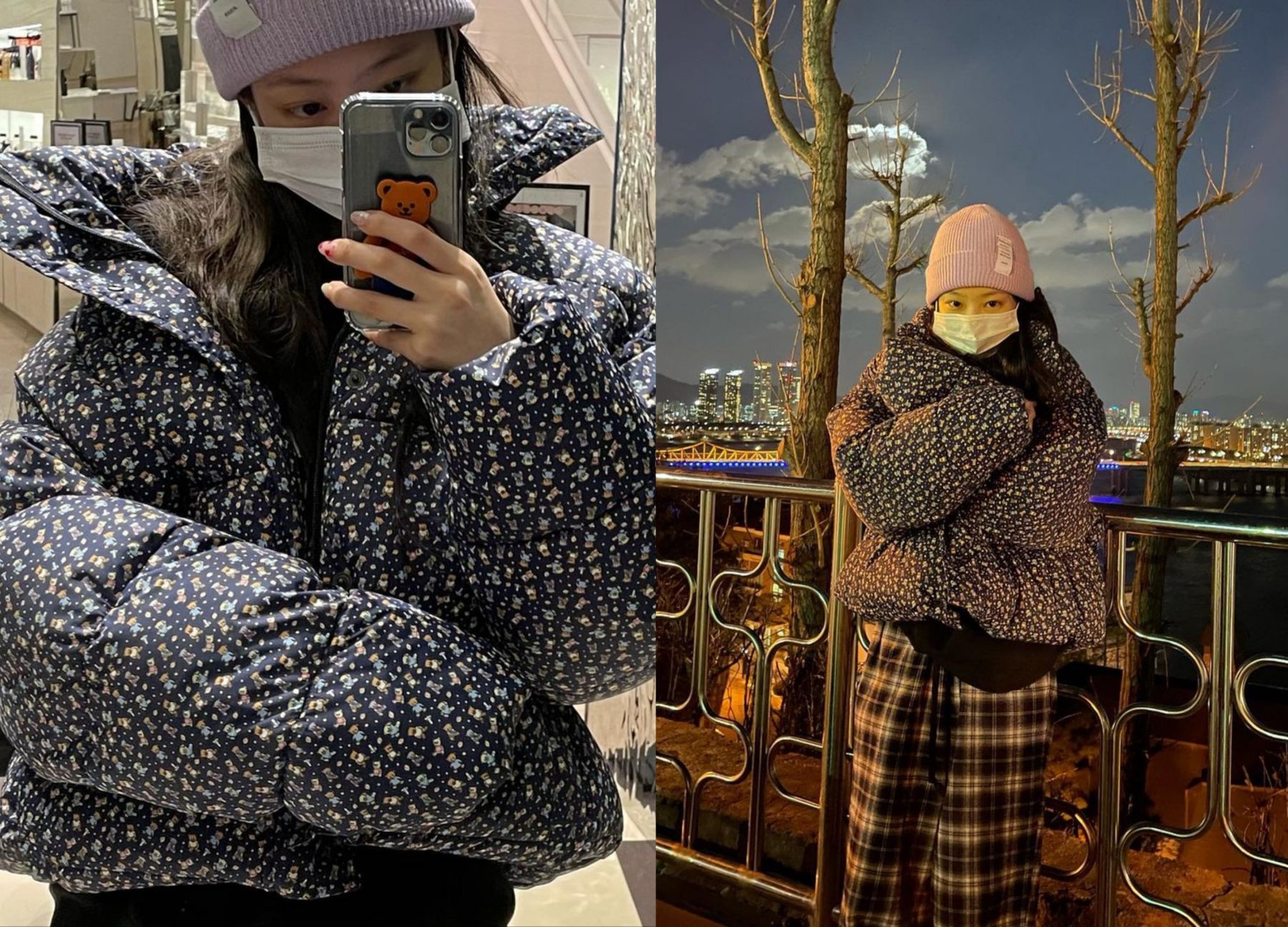 Jennie 同樣穿上佈滿圖案的 puffer jacket,而她所選的正是 Balenciaga 印上小熊圖案的款式,映襯她的甜美個性。