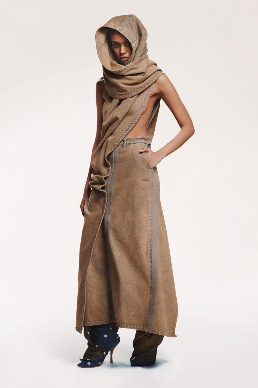 除了聯名系列,Y/Project對日常單品的再創造同樣令人印象深刻。品牌運用金屬線技術打造的扭曲牛仔系列,將傳統的藍色牛仔面料轉化為極具戲劇張力的服飾。牛仔褲的褶皺、捲曲和異形結構,讓日常穿搭成為一種藝術表達。這種設計方式不僅展現出品牌對材料和工藝的深度研究,還賦予服裝更多層次感和故事性,讓穿着者能夠在實用與藝術之間自由流轉。