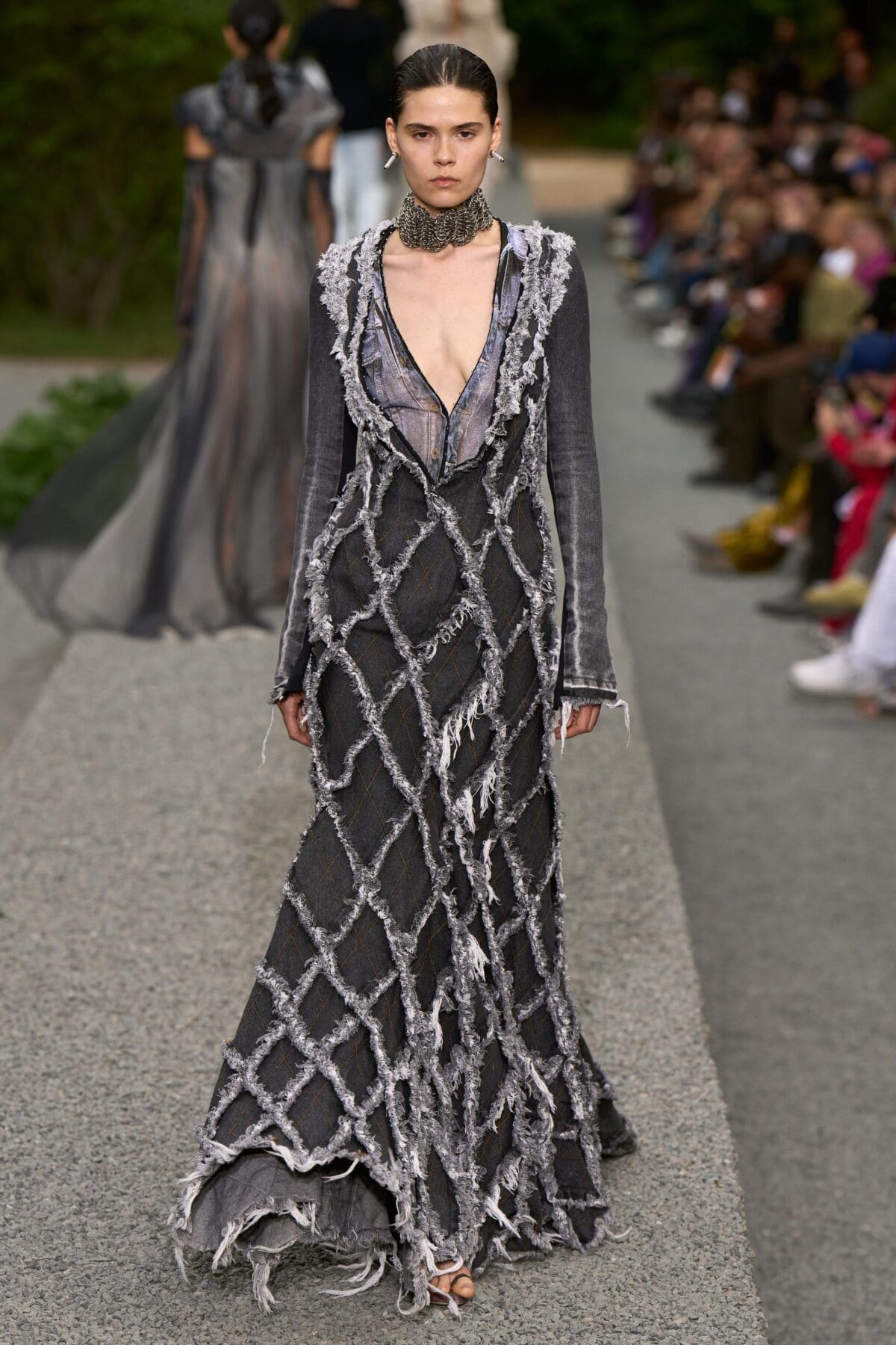 除了聯名系列,Y/Project對日常單品的再創造同樣令人印象深刻。品牌運用金屬線技術打造的扭曲牛仔系列,將傳統的藍色牛仔面料轉化為極具戲劇張力的服飾。牛仔褲的褶皺、捲曲和異形結構,讓日常穿搭成為一種藝術表達。這種設計方式不僅展現出品牌對材料和工藝的深度研究,還賦予服裝更多層次感和故事性,讓穿着者能夠在實用與藝術之間自由流轉。