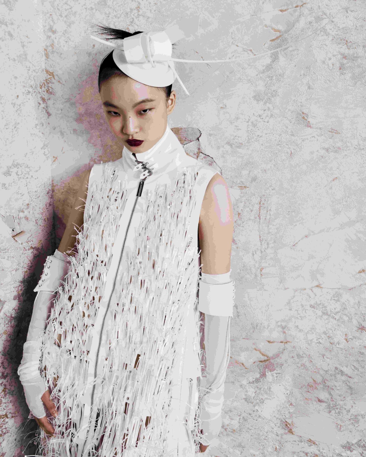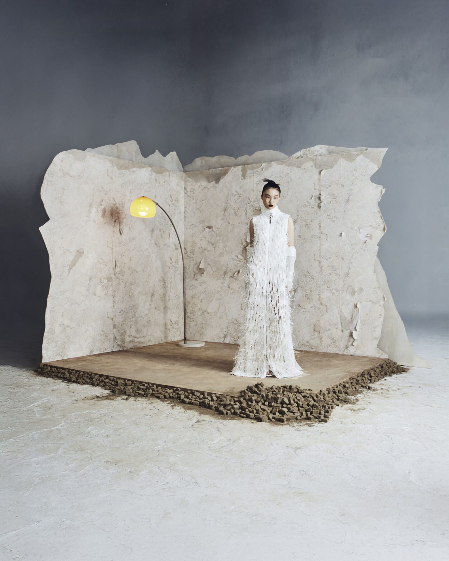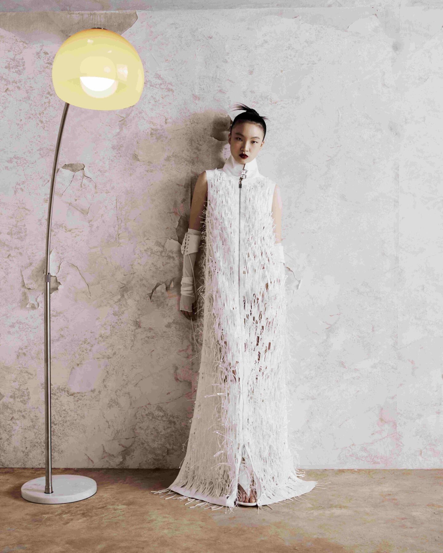 今次她帶來的系列名為《Duhkha》,以佛教中的「苦」為概念,將痛苦視為成長的催化劑。TY 受藝術家阿部幸子(Sachiko Abe)的剪紙藝術啟發,將白布切割成細條並層疊成輕柔形態,模擬冥想與重複工藝所帶來的心靈平靜。系列透過輕盈面料與層次剪裁,詮釋痛苦的脆弱與韌性,通過四階段設計追溯「苦」的旅程,頌揚內在韌性與轉化的美。在 TY 看來,痛苦非必須解決的「問題」,有時我們應該學會接納,與之共存。