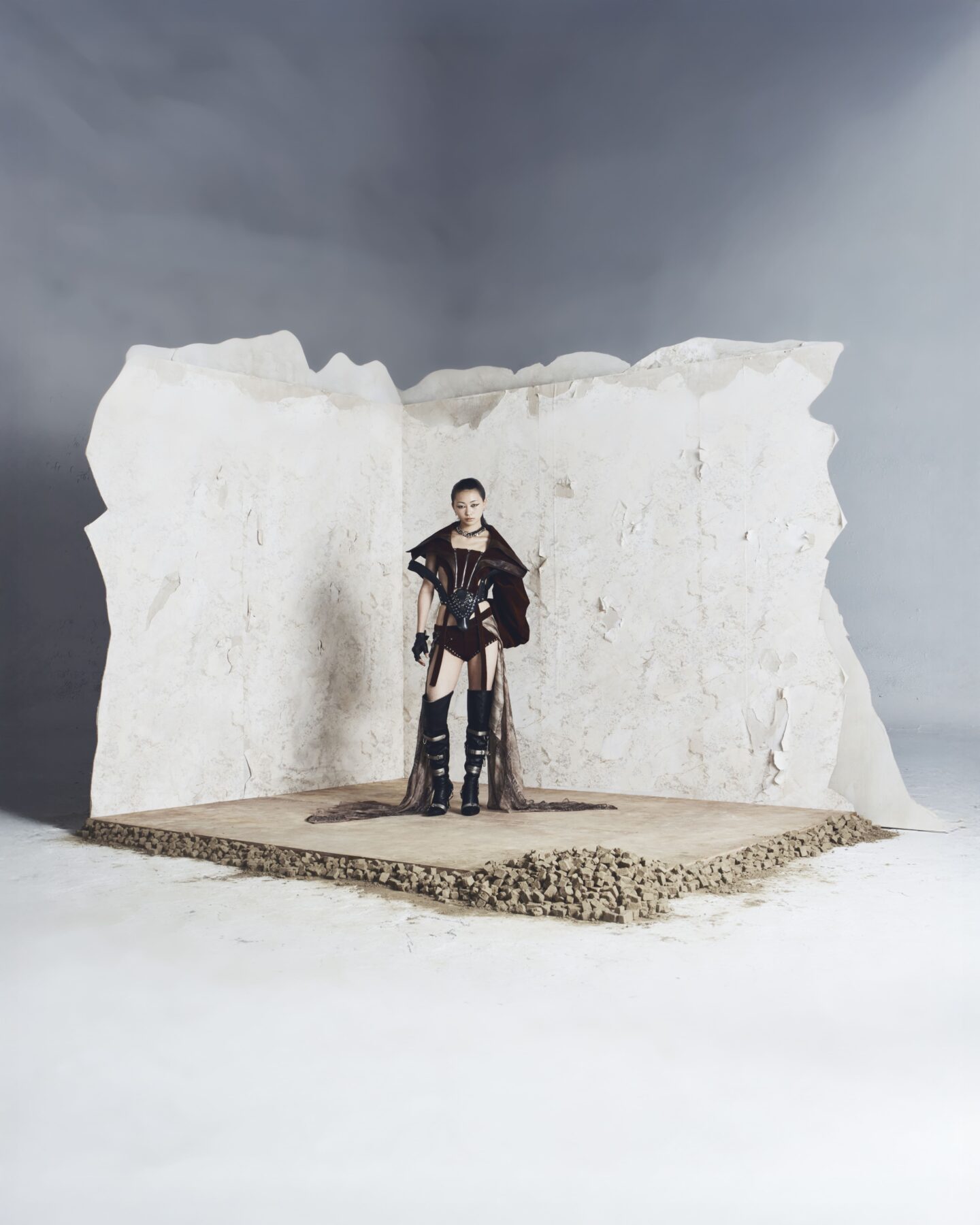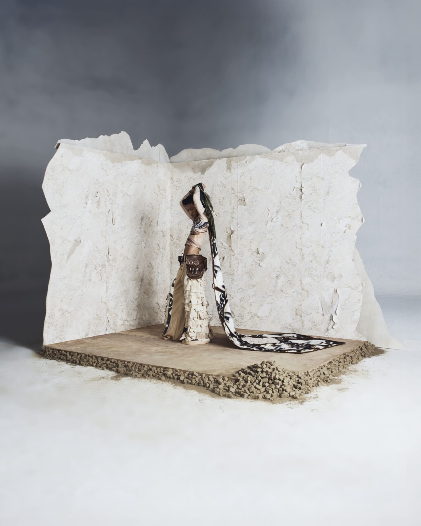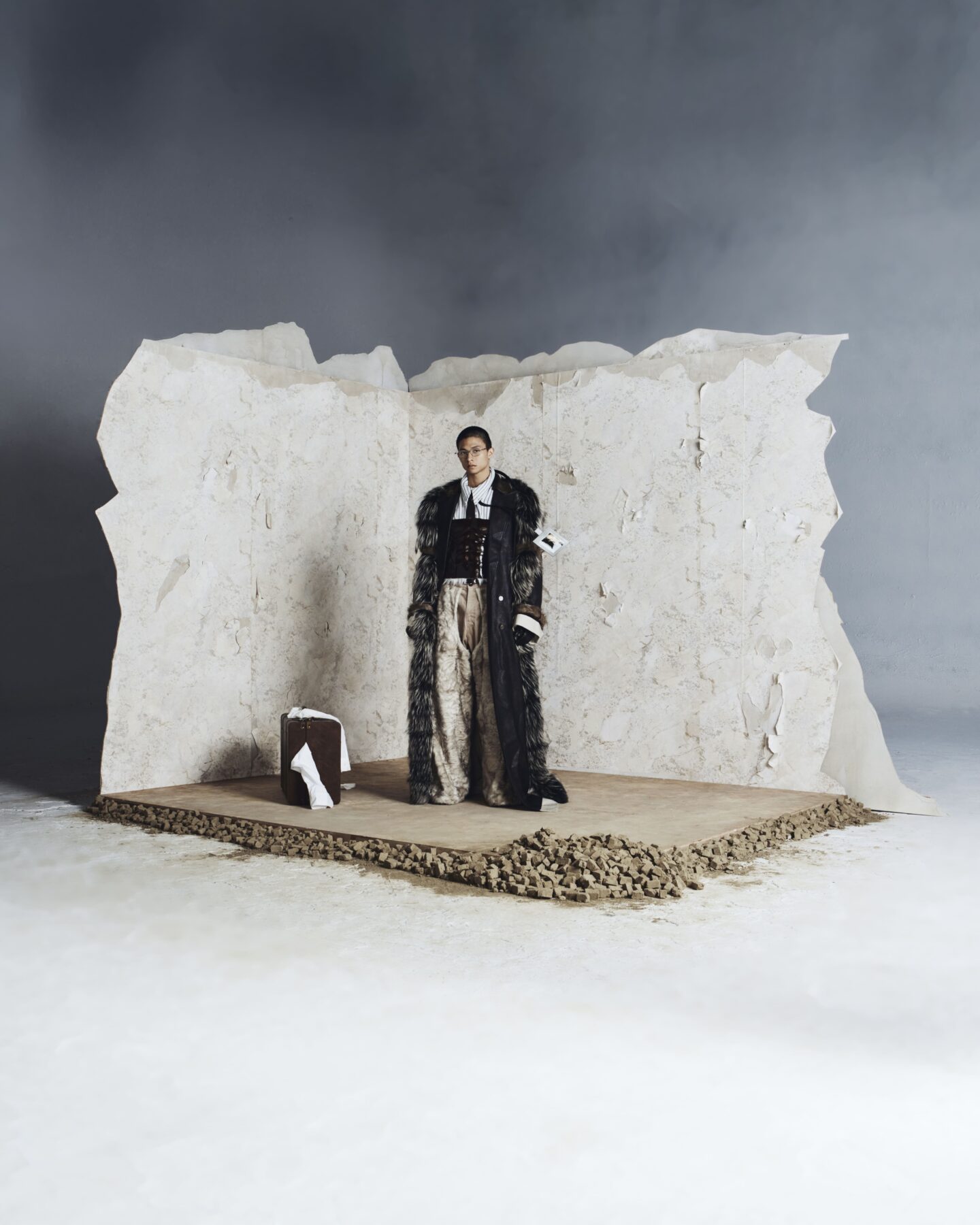 由她帶來的時裝系列《Scars of the Earth》以一段關於大地傷痕的詩意故事為主題,探討隱藏於地表之下的生命脈絡,感受自然與生命的韌性。Iris 運用大地色調與樹皮紋理,透過不規則剪裁裙擺模仿樹木生長形態,又用布料的觸感去詮釋傷痕與成長的痕跡。「真正的美源於擁抱獨特性 —— 這些傷痕是大地的記憶,也是我們的生命故事。」Iris 希望這個系列能啟發每個人珍視自己的旅程,在時裝中尋找與自然及自我的深層共鳴。