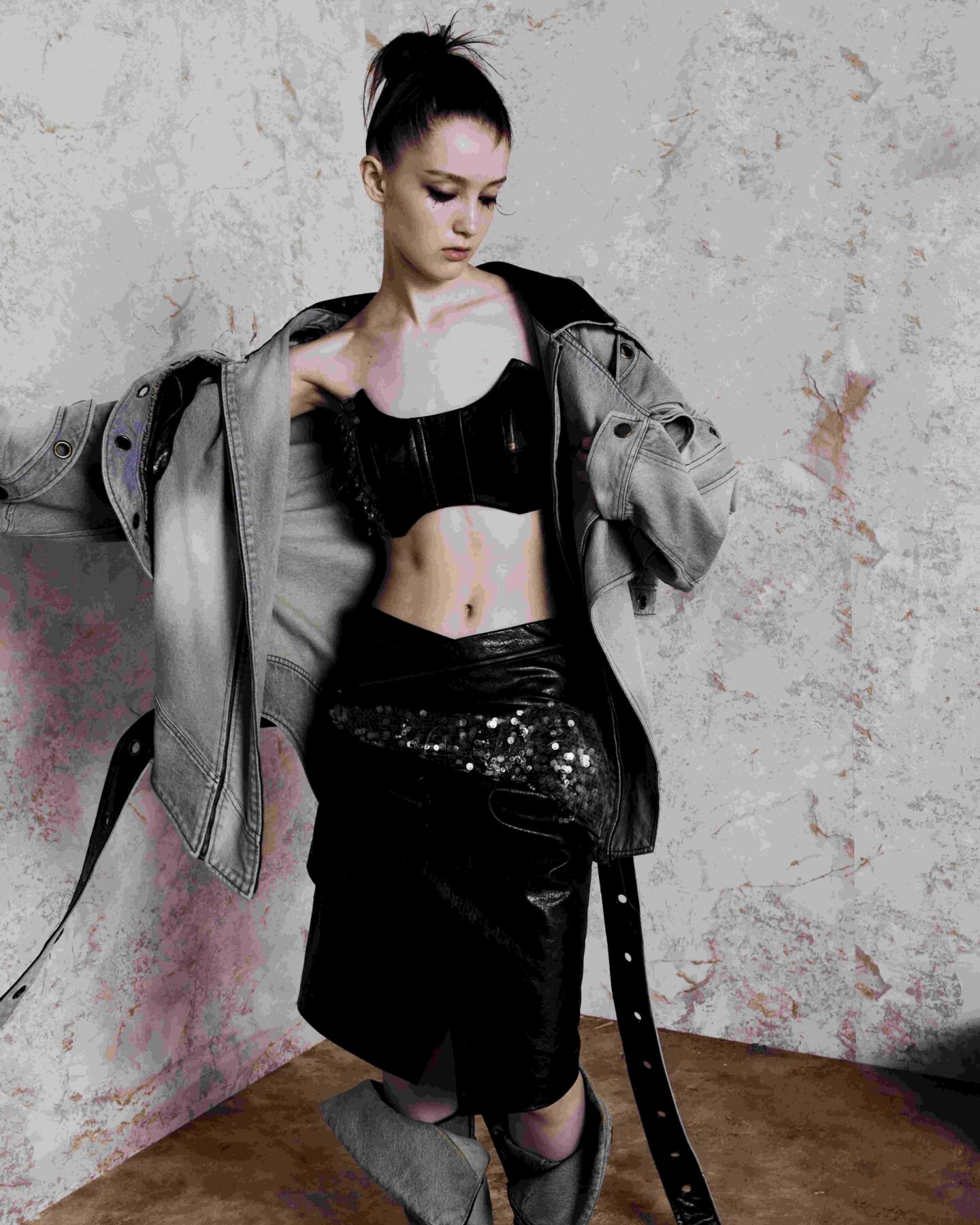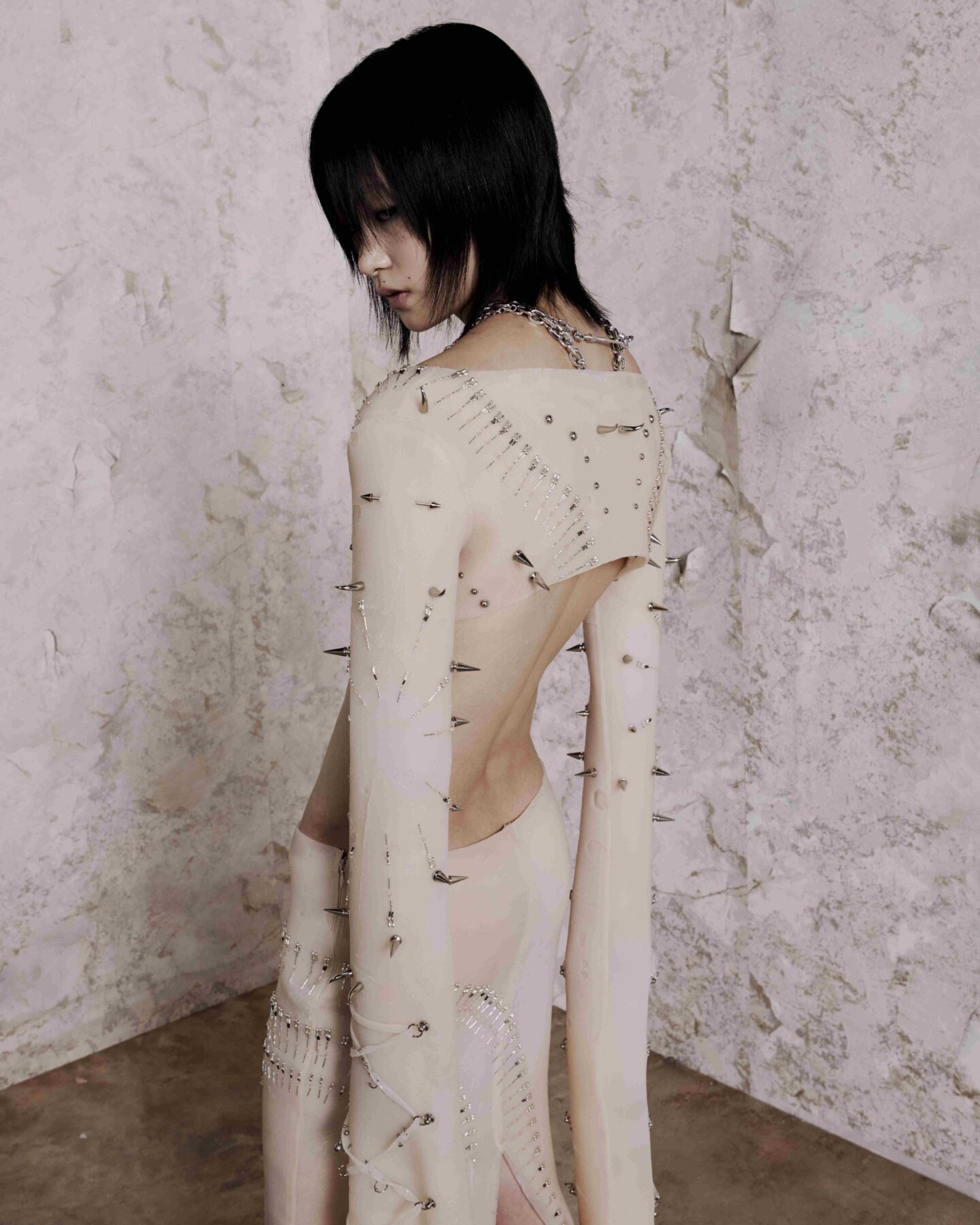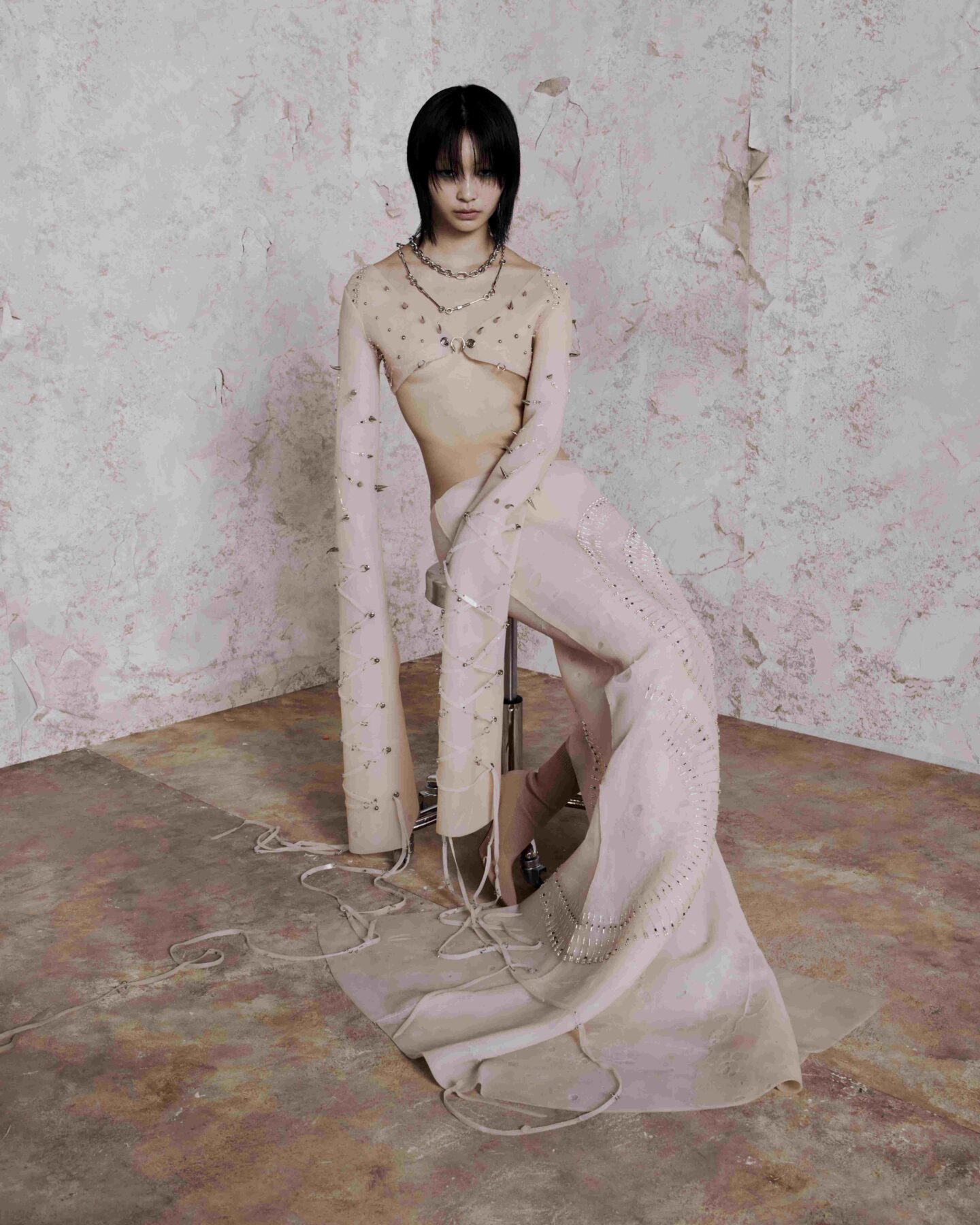 希雅的參賽系列《In Pain》從 BDSM 文化汲取靈感,探索一個在痛苦中尋求快感的社群,揭示「痛與樂」交匯的模糊界線。對希雅而言,這種感官體驗與「濕疹」息息相關——抓癢的瞬間帶來短暫快感,卻也留下血痕、傷口與疤痕,日復一日循環往返,這種身體與情感的拉鋸,成為她創作的核心靈感。希雅運用仿皮膚材質、繩結細節與皮革對比,模擬傷口與疤痕的質感,並以曲線剪裁暗示感官體驗。服裝既是身體的延伸,也是情感的載體,挑戰傳統對美與痛苦的認知。