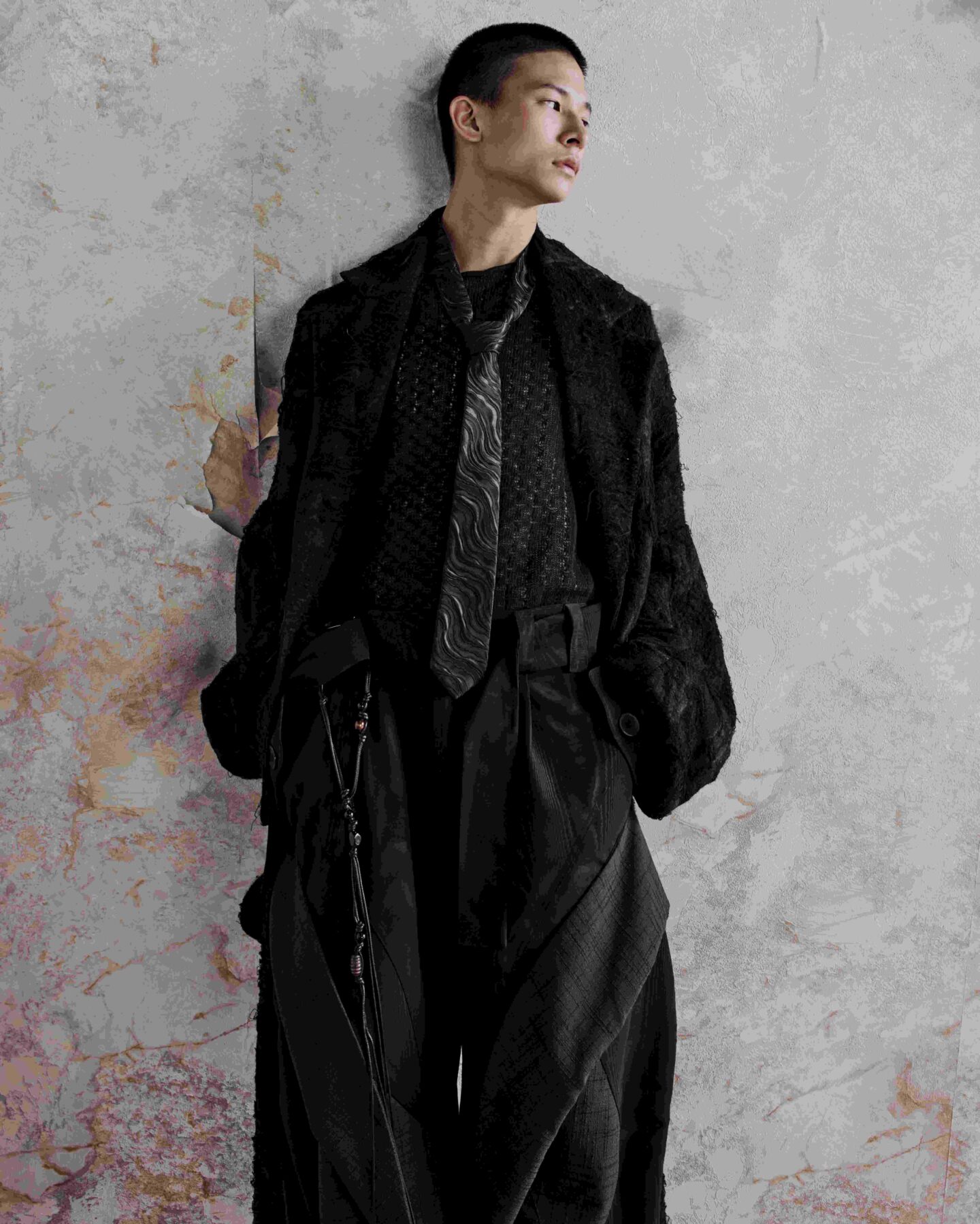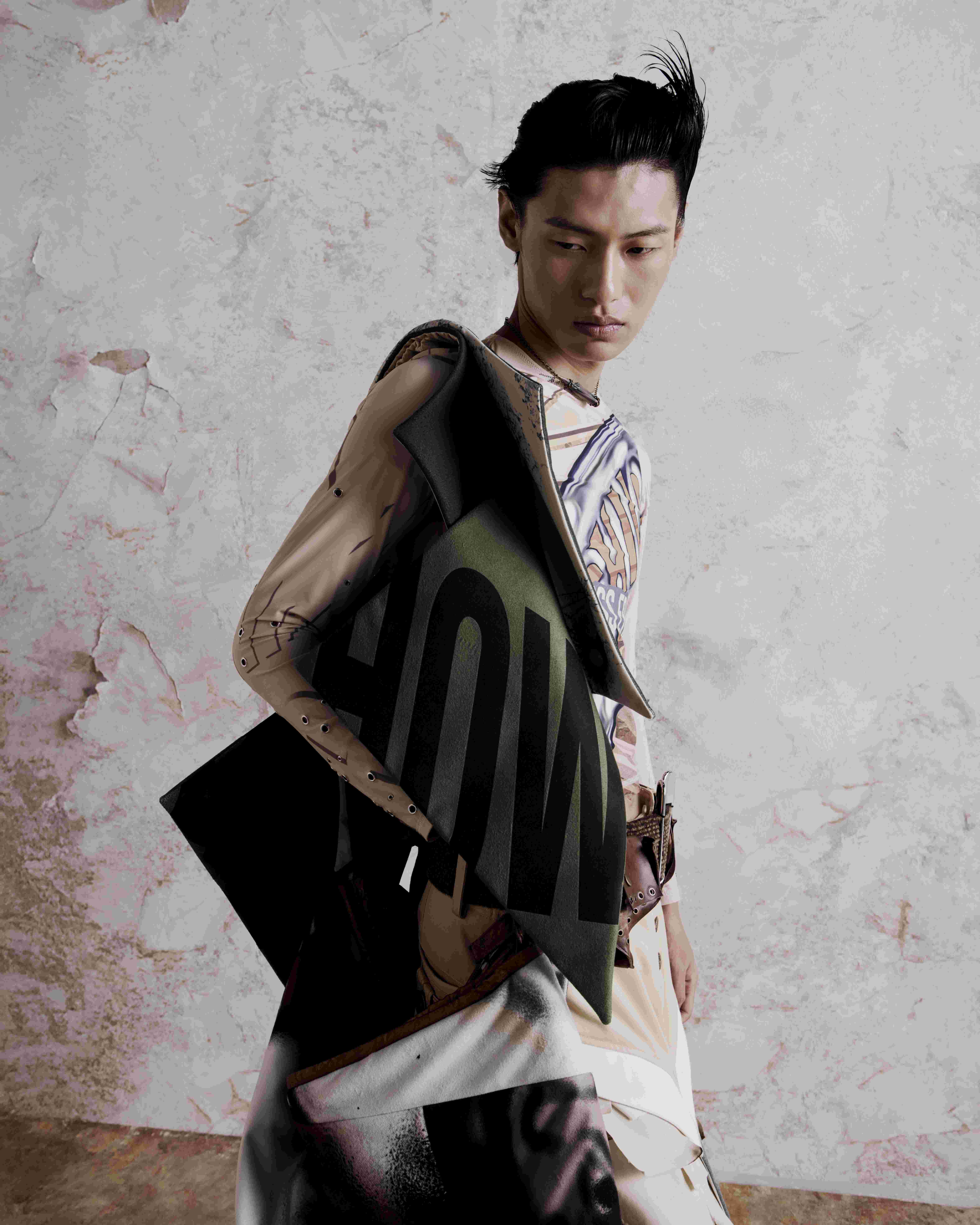 他今次參賽系列名為《Men and Vehicle》,Jeffrey 從 Queer community 中汲取靈感,用時尚單品探索並重新定義刻板印象中的陽剛文化。他將皮革褲、牛仔元素與 Tom of Finland 藝術中的戲劇化造型融合,透過火焰圖案、流線型剪裁和質感對比,打造出充滿顛覆性的男性美學。他認為,服裝應從壓迫性的象徵轉化為解放與自我表達的工具。為 YDC 2025 創作的四套造型不僅融合了電單車文化的力量與速度,更透過誇張比例與性感張力,邀請大家重新思考男性氣質。