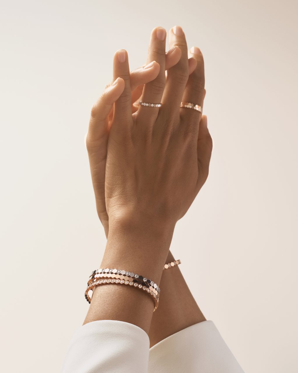 Chaumet Bee My Love玫瑰金手鏈,鑲嵌7顆Taille Impératrice形鑽石(各重0.23克拉) HK$238,000 Chaumet Bee My Love玫瑰金戒指,鑲嵌3顆Taille Impératrice形鑽石(各重0.23克拉) HK$90,400