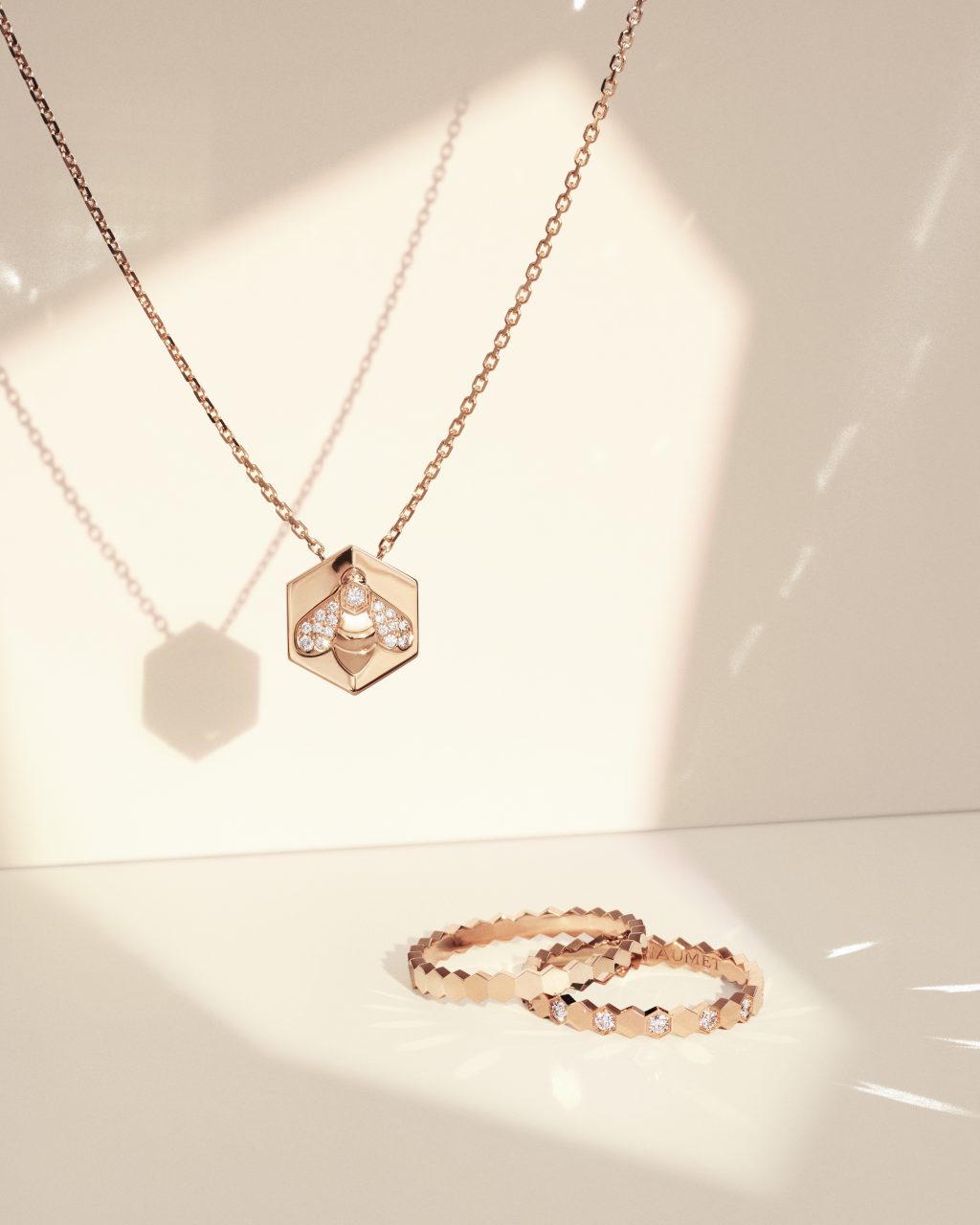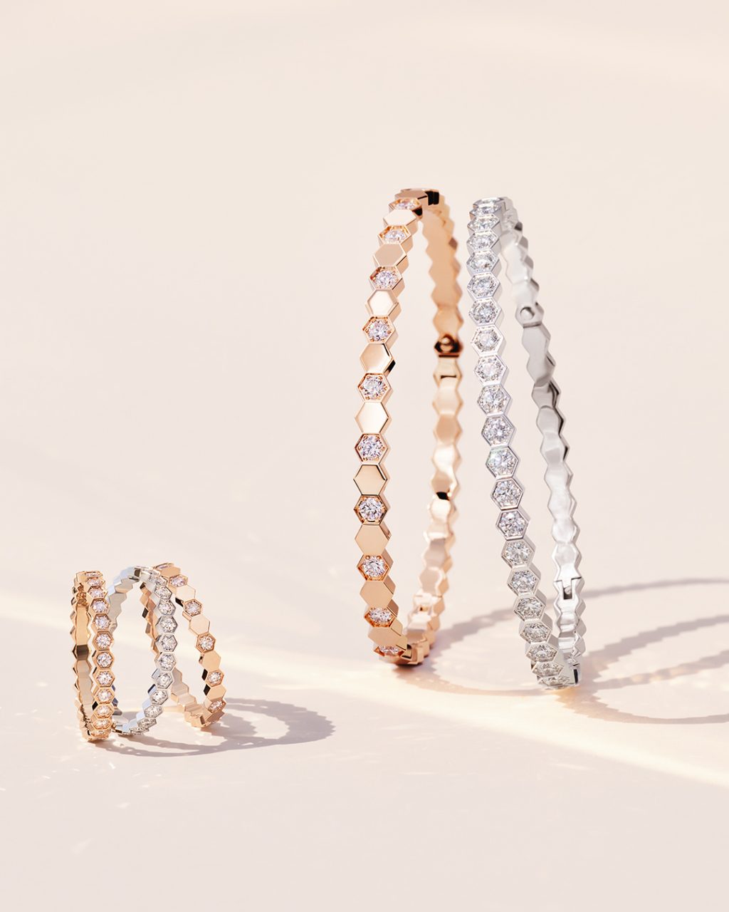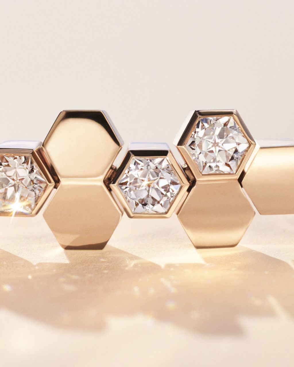 全新 Bee My Love 珠寶包括一系列鑲嵌了 Taille Impératrice 切割鑽石,讓由不對稱幾何線條組成的珠寶套裝更加閃亮。而玫瑰金與鑽石蜂巢排列成一條短項鏈和手鏈,更能與系列的戒指和懸垂式耳環巧妙地配搭,創造出無限的配搭風格,更在舉手投足間綻放璀璨魅力。