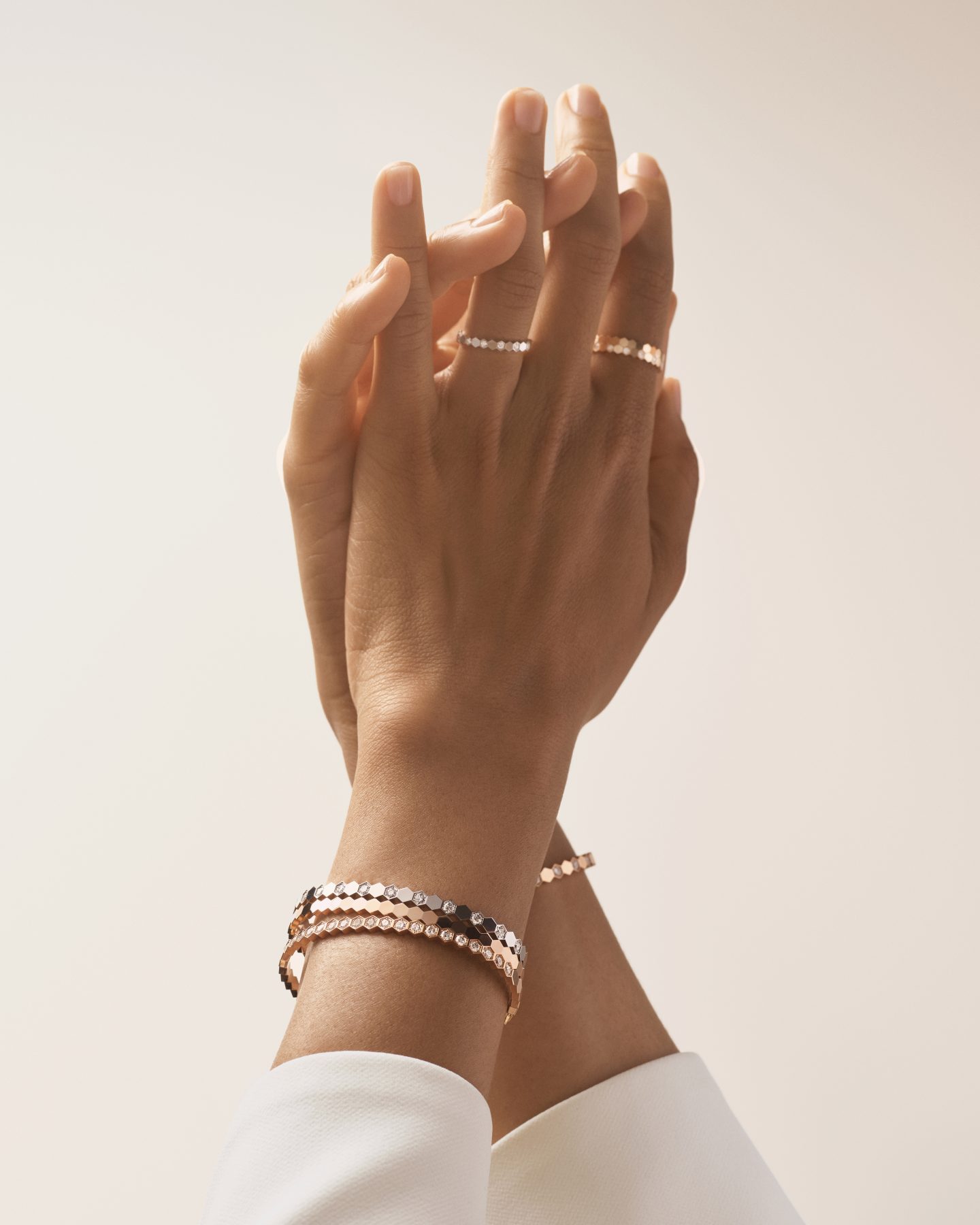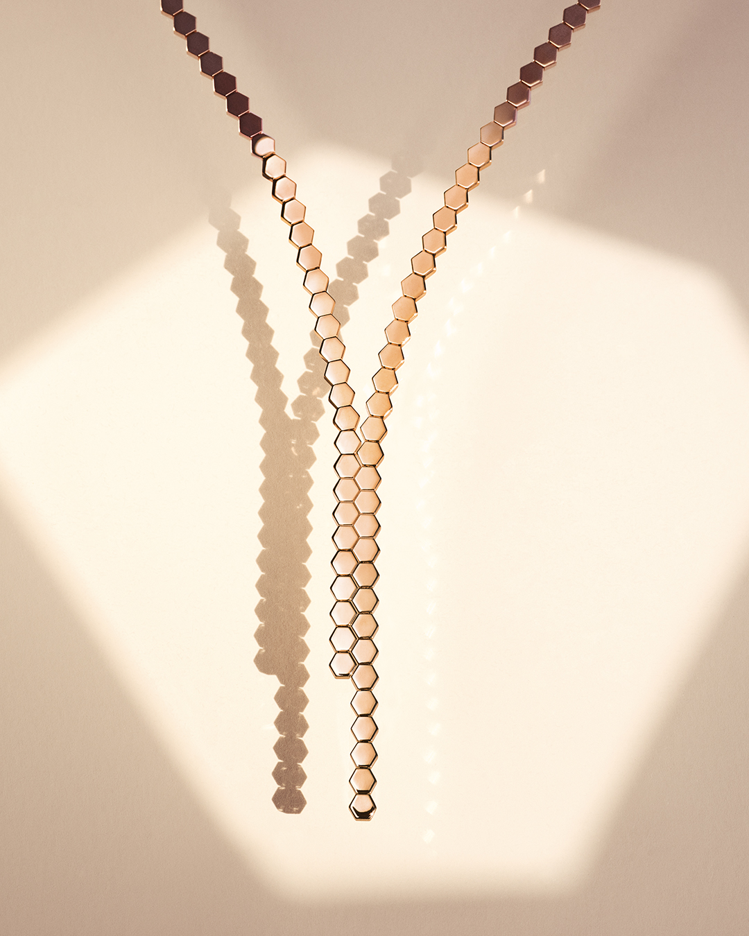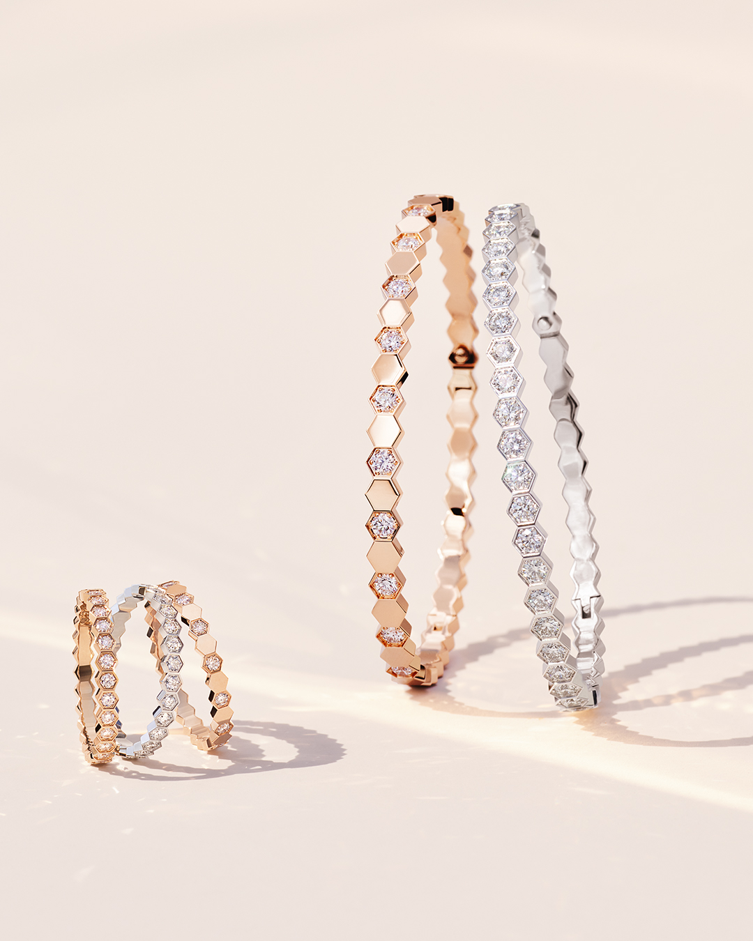 全新 Bee My Love 珠寶包括一系列鑲嵌了 Taille Impératrice 切割鑽石,讓由不對稱幾何線條組成的珠寶套裝更加閃亮。而玫瑰金與鑽石蜂巢排列成一條短項鏈和手鏈,更能與系列的戒指和懸垂式耳環巧妙地配搭,創造出無限的配搭風格,更在舉手投足間綻放璀璨魅力。