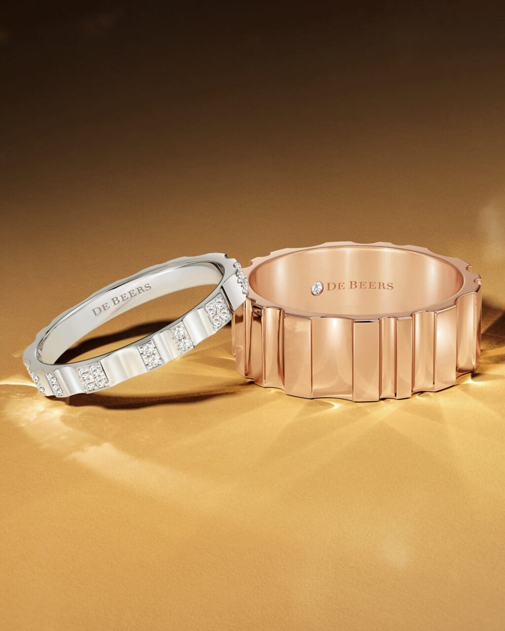相比以上提及的Enchanted Lotus鏤空鑽石戒指,De Beers RVL珠寶系列的設計更加剛性而簡約,以玫瑰金、白金、黃金配搭密釘鑲鑽石,亦提供無釀鑽款式,尺寸由最纖幼的2.6mm到最寬的6.6mm,提供非常靈活的選擇,尤其適合喜歡層疊搭配珠寶呈現個人風格的另一半。今年2月,該系列更首度推出了玫瑰金調的2.6mm鑽石戒指,為佩戴者帶來更多個性化選擇。
