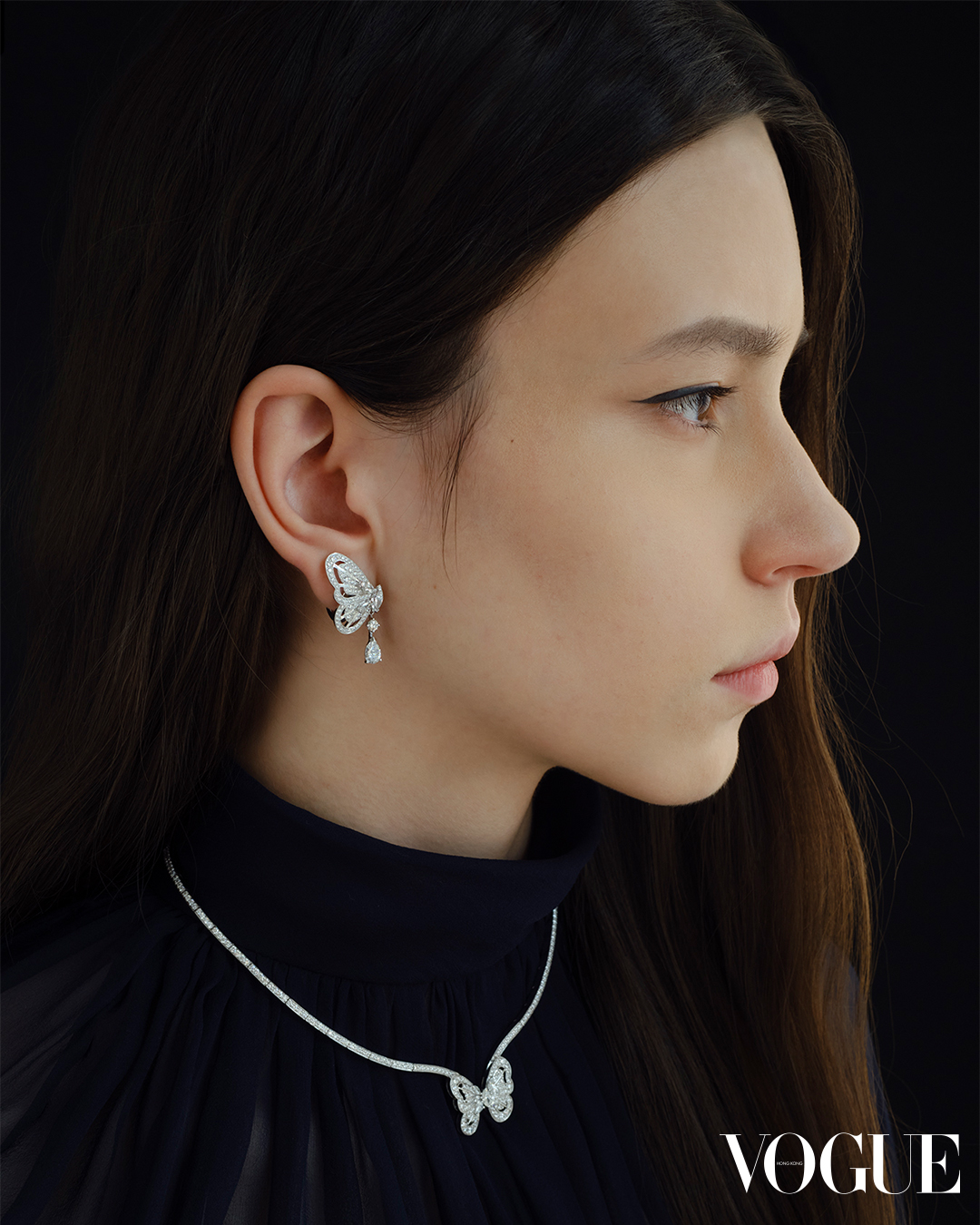 系列以細膩的鏤空設計為特色,尤如與光影共舞;由多種不同形狀的花式切割美鑽結合密鑲鑽石,勾勒出蝴蝶羽翼的美麗輪廓。流線形項鍊密鑲白鑽,與蝴蝶的翅膀無縫銜接;密鑲鑽石的垂墜式耳環突顯蝴蝶翅膀獨特之美,捕捉它停駐的瞬間,耳環上的梨形切割鑽石吊墜為可拆卸式設計,提供更自由自主的造型配搭。