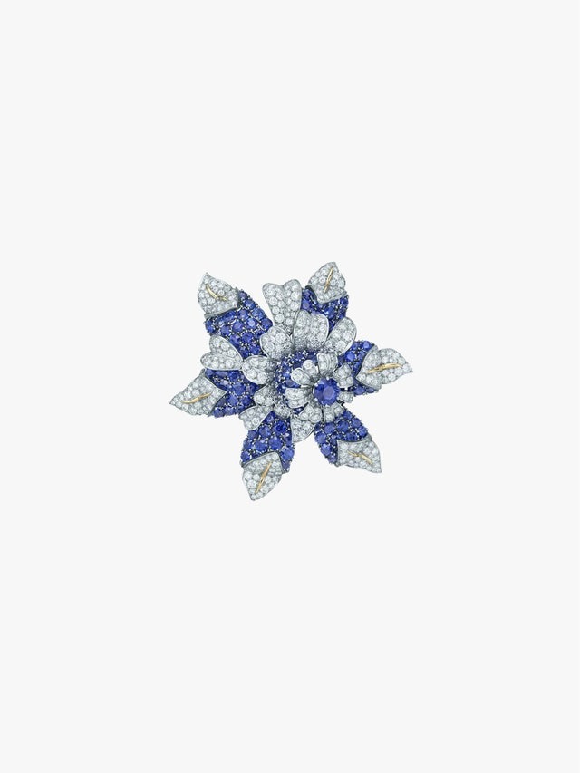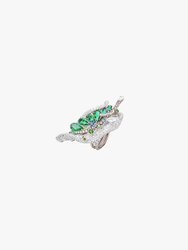 英國珠寶商 Anabela Chan 將實驗室培育的寶石與不尋常的金屬搭配在一起,創造出輕盈而有衝擊力的花卉作品,這些作品的尺寸往往也令人印象深刻。
